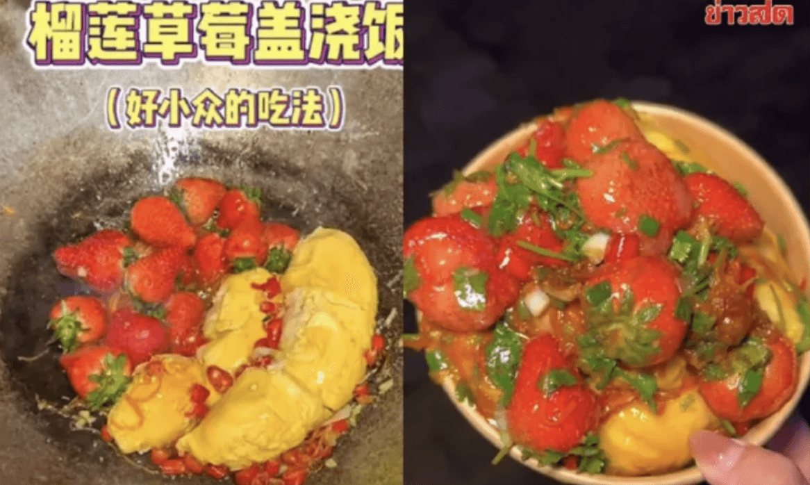 近日在中國社交網路上出現一款被網友稱之為暗黑料理的「榴槤草莓蓋澆飯」,不僅要將榴槤下鍋翻炒,還要加入草莓、香菜、生抽等配料,食材搭配方式十分前衛,讓不少網友不敢恭維,不過也有人表示願意嘗嘗味道,這道獵奇料理更紅到泰國,掀起泰網熱烈討論。