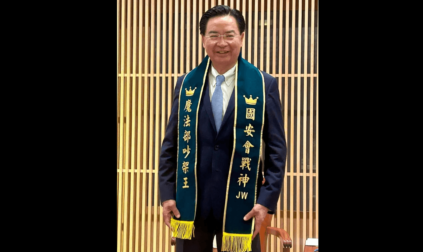 吳釗燮10日透過外交部threads發文,秀出一張批著印有「魔法部吵架王」、「國安會新戰神JW」的彩帶照片,並表示:「媒體朋友給我的封號…各位脆友覺得有道理嗎?面對無理的質疑,林北一定給你吵到底;面對中國的威脅,林北一定奮戰到底!」