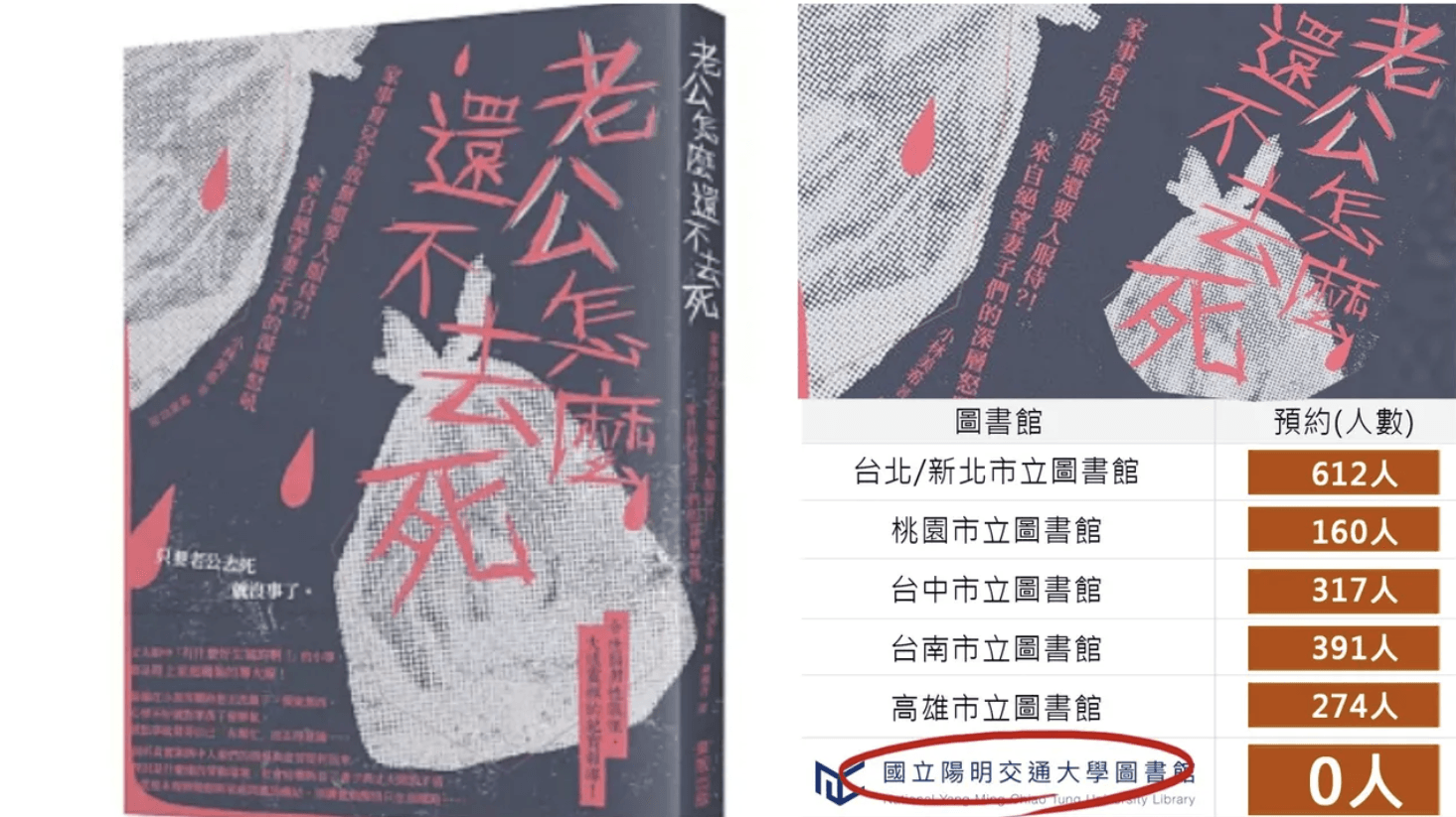 陽明交通大學圖書館小編近日在臉書發文指出,《老公怎麼還不去死:家事育兒全放棄還要人服侍?!來自絕望妻子們的深層怒吼》截至9日為止,雙北市立圖書館有612人預約,桃園市立圖書館有160人,台中市立圖書館有317人,台南市立圖書館有391人,高雄市立圖書館則有274人,陽明交通大學圖書館則是0人。