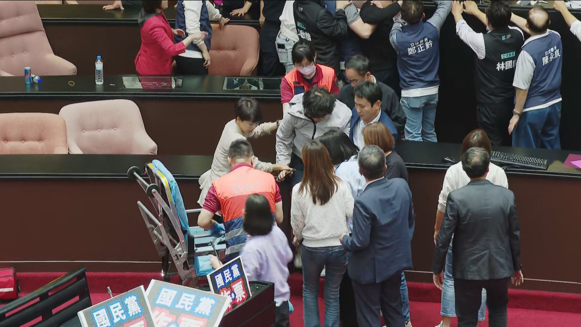 立法院今(17日)針對國會改革等相關法案進行表決,不過藍綠雙方立委卻從一早開始,就在議場內外頻頻爆發衝突,傍晚進入討論事項表決時,雙方立委再度開戰,民進黨立委們試圖想自主席台後方大門衝入議場,國民黨立委則形成人牆圍堵。過程中民進黨立委沈伯洋、邱志偉被從高處拉下,沈伯洋頭著地後遭擔架抬上救護車,後續邱志偉、鍾佳濱等人也接連送醫。