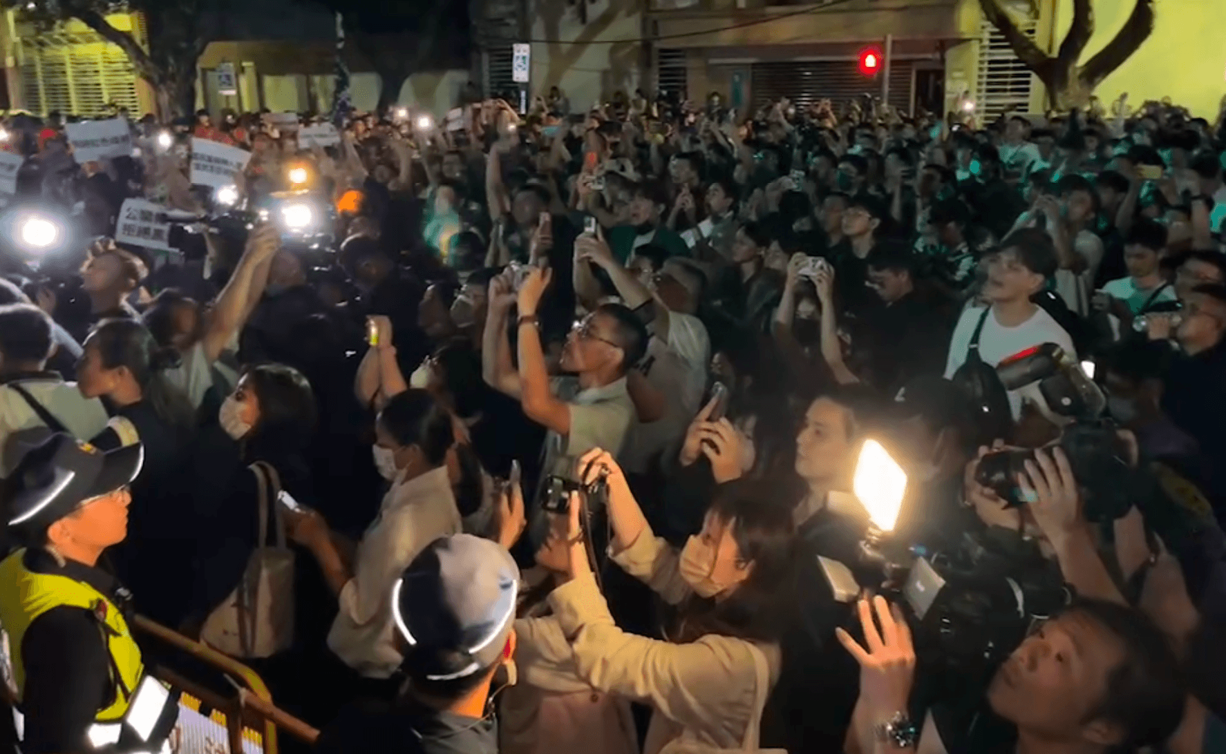 而在晚間9點30分左右,開始有青年聚集在立法院外,高舉「沒有討論不是民主」、「譴責歧視暴力,國民黨道歉」標語。現場青年也高喊「停止表決、實質審查」、「退回法案、停止開會」等口號,多位民進黨立委得知支持者在外集結,也透過鐵門向外致意,吳思瑤更爬上鐵門,向支持者比讚。
