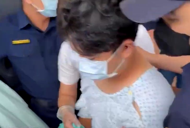 台中捷運今(21日)發生隨機砍人案,犯案的20歲洪姓嫌犯預藏3把刀刃砍傷2名乘客,自己的右手也被利刃劃傷戒護就醫,當時他的情緒非常激動,院方將他全身麻醉後才進行治療。洪嫌甦醒後經過主治醫生同意,將他帶到台中第六分局訊問,鏡頭前他穿著病人袍、打赤腳戴口罩,面對記者提問不發一語。