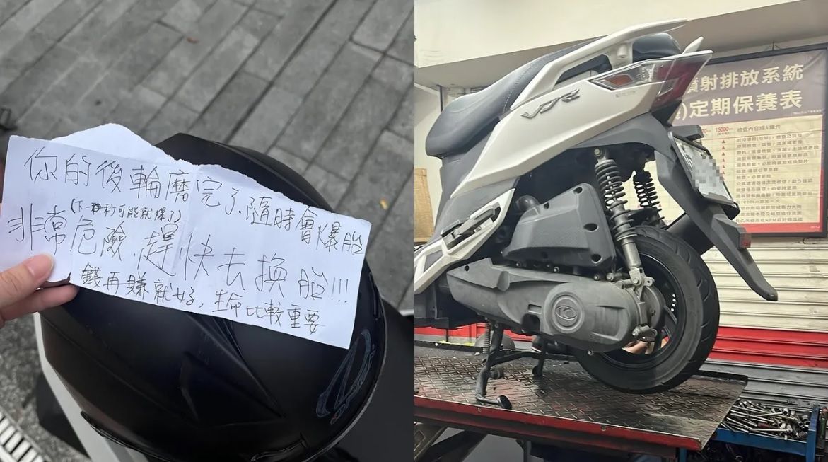 日前一名女網友在Threads上發文表示,在一中街停車,遠看車子上夾了一張紙條,以為又被開單,結果竟然是貼心小提醒,紙條上寫道「你的後輪磨完了,隨時會爆胎!(下一秒可能就爆了)非常危險,趕快去換胎,錢再賺就好,生命比較重要」,讓原PO感動直呼「好想知道是誰這麼貼心」,盼大數據能找到這名好心人,事後也立刻到機車行換輪胎。
