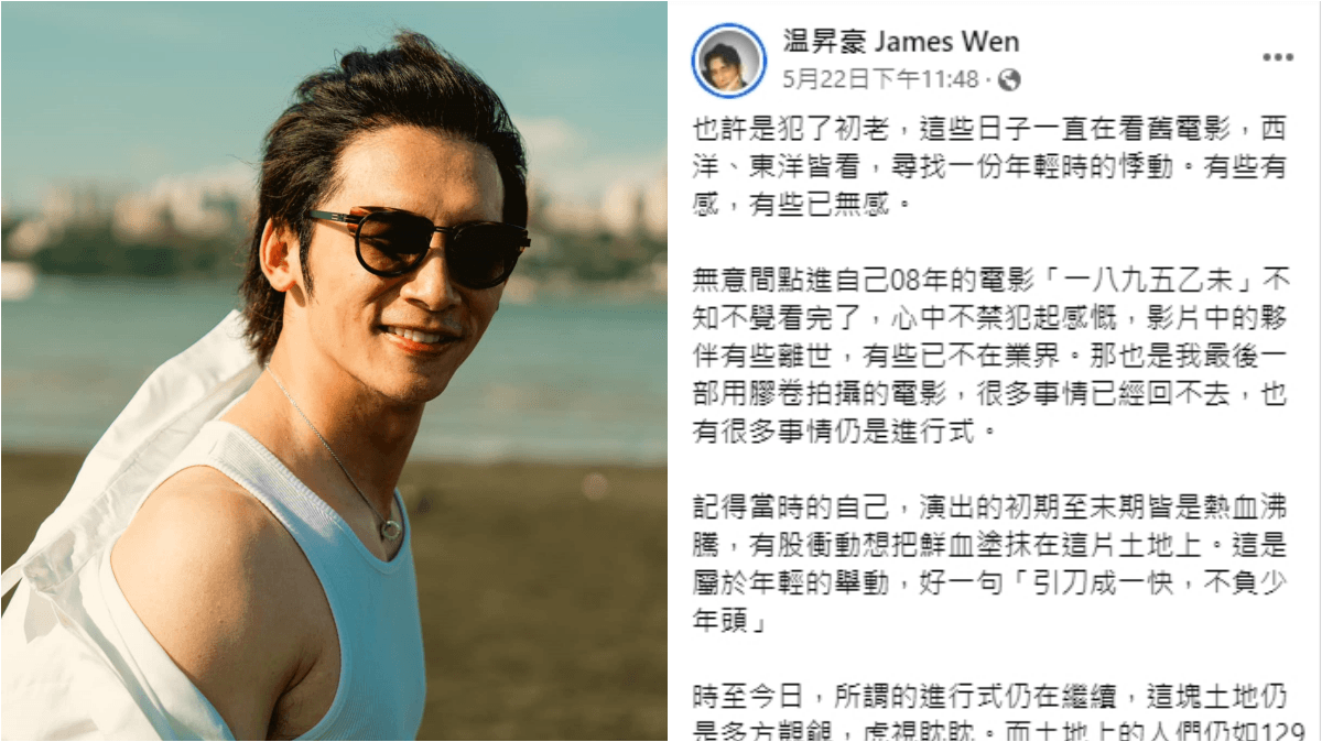 我國總統賴清德520宣誓就職時,強調兩岸「互不隸屬」,引發中國不滿。中國官媒《央視》22日發布「反台獨」貼文,許多台灣藝人相繼轉發;然而,台灣演員温昇豪22日晚間在臉書上發文,回顧自己曾參演的台灣歷史作品《一八九五乙未》,並提及「四百年」、「母親的身世」等關鍵詞,引發網友熱烈討論。