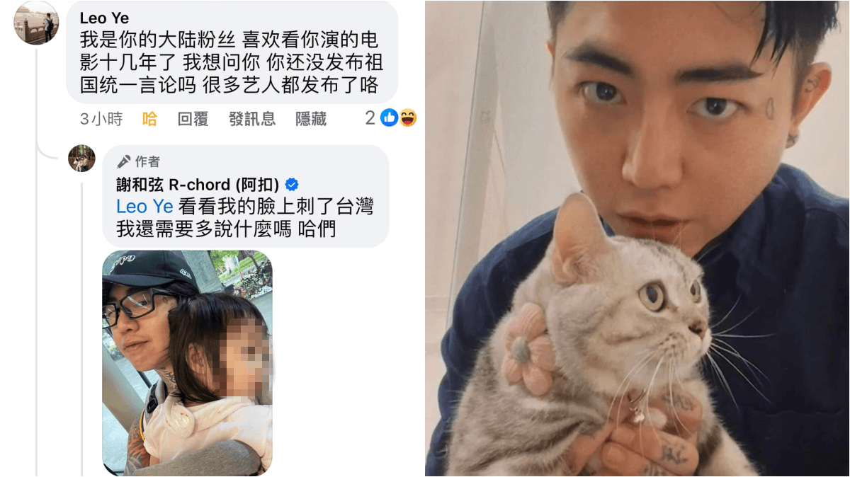 近期,未表態的台灣藝人都會遭到中國網友逼問,要求轉發反台獨聲明,就連人在南韓工作的「國民老公」許光漢,也被當地中國人鬧場,要求他積極表態。而歌手謝和弦今(28日)遇到一名中國網友表示,自己喜愛觀看他演出的電影10多年,並詢問「你還沒發布祖國統一言論嗎?很多藝人都發布了」。