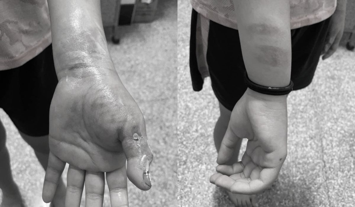 家屬指控,安親班英文老師因為女兒功課沒寫完、缺課未補等,因而動手體罰,家屬也將女童傷勢拍下,直言:「我自己都沒有這樣打過她,到底憑什麼?」只見女童左手掌、手腕傷勢嚴重,多處脹紅、大拇指和手腕也都有瘀青,右手也有兩道泛紅傷痕,家屬表示,除了手部外,屁股也都瘀青,「到底要使多大的力氣才能打到連指甲都青了,請問這位老師是不是該去看一下心理醫生」。