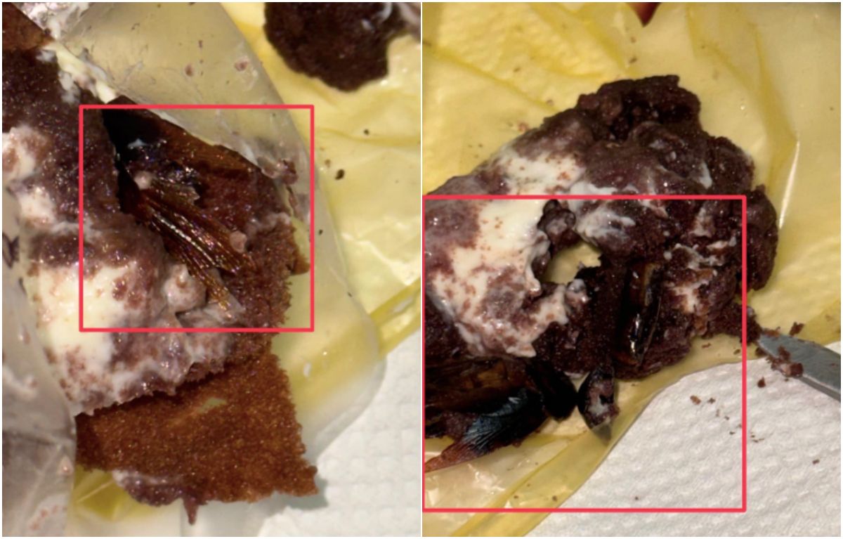 女網友今(30日)凌晨在臉書社團「爆料公社(官方粉專專屬)」發文,指自己29日下午3時許到烘焙店買蛋糕,並依照店員提醒,返家就連同袋子放進冰箱保存,30日凌晨1時許拿出蛋糕享用時,卻吃到奇怪口感,吐出來發現「卡滋」聲響來自大蟑螂,讓她相當崩潰。