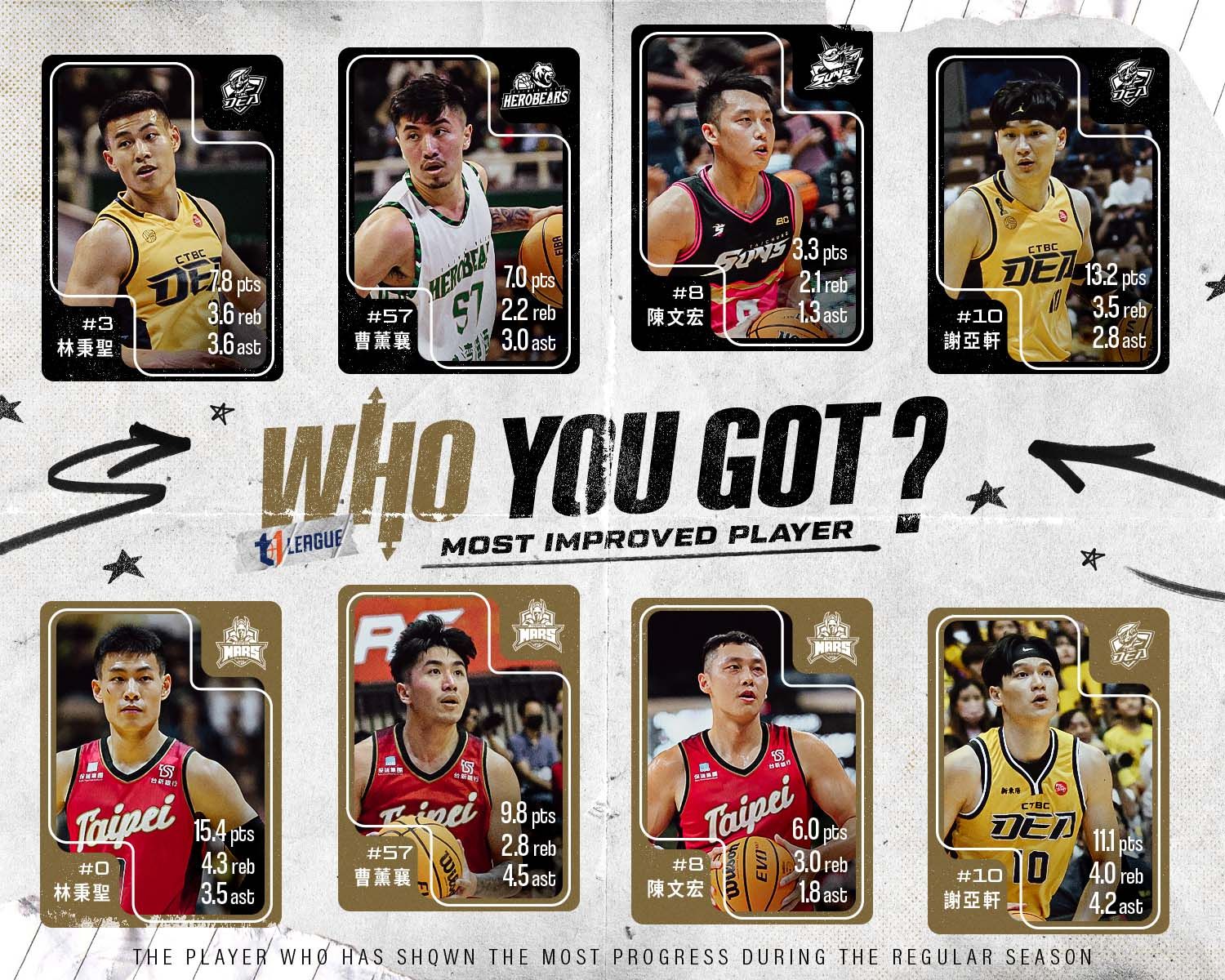 年度進步獎資格為上季已經參加T1聯盟賽事之球員,且本季例行賽出賽場次達17場之各隊球員。獎項將於6月12日頒獎典禮正式揭曉,歡迎球迷朋友下午三點一起鎖定官方YouTube頻道,共同為進步獎得主歡呼!