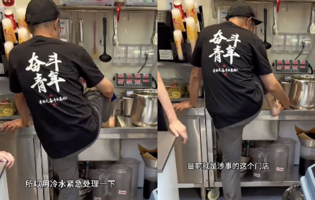 中國一家蜜雪冰城分店被拍到,一名身穿黑色制服的男子,把腳放進店內水槽中沖洗,並在工作台上檢查一番,才將腳放回地上套上鞋子,而一旁就是店內鍋具、飲料杯等,畫面曝光後讓許多中國網友嚇得直說不敢喝。