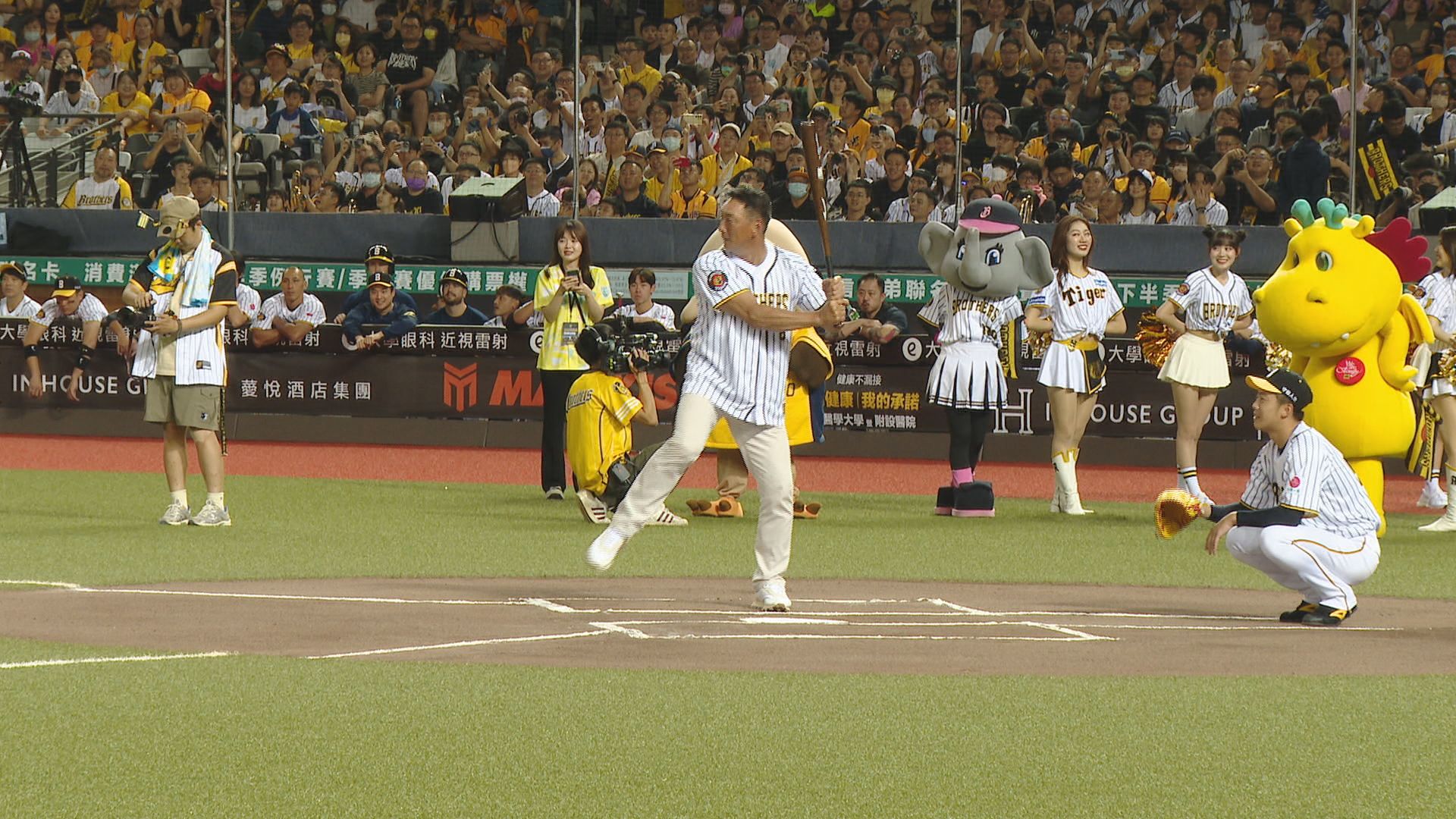 前阪神虎一軍監督金本知憲:「現在來做這個開球,有點不好意思。進到球場來就會想起以前的事情,來到球場這個氣氛都很讓人懷念,也有很棒的一個氣氛。」鐵漢柔情,也促進球迷熱情,黃衫軍希望藉由這樣的活動,挑戰3萬人球迷進場,突破龍象戰歷史新高。