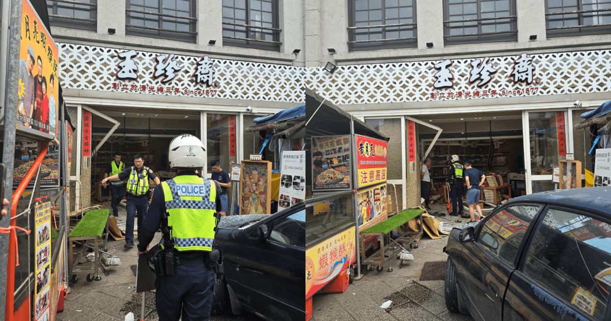發生衝撞事故的是玉珍齋天后宮分店,開業約20年,今天下午2時15分一輛自小客車行經中山路時,突然撞進店裡,衝擊力導致玻璃鋁門倒塌,貨架、品散落一地,警消獲報到場處理,自小客車61歲駕駛輕傷,另一名56歲在餅店消費的顧客則是遭碎玻璃劃傷,所幸2人傷勢僅擦挫傷,送醫救治後已無大礙。