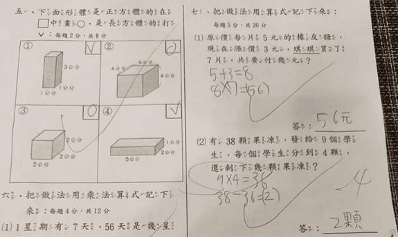 一名國小家長近日在網路發文求救,學校考卷題目問「有38顆果凍,發給9個學生,每個學生分到4顆,還剩下幾顆果凍?」自家小朋友寫出算式「9×4=36」,而38減36後還剩2顆,答案雖然正確,算式卻被老師用紅筆圈起扣分,讓家長不解到底哪裡有錯。不少網友認出這是小學二年級的考級,紛紛熱心解答。