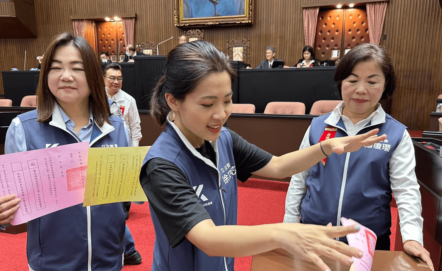 徐巧芯說,如果有什麼情況,就「兵來將擋、水來土淹」,不過截至目前為止,藍綠雙方並未傳出衝突事件。稍早徐巧芯也透過臉書發文,秀出自己投票表決的照片,喊話「投票完成!團結一心,反對覆議案」,並寫下「等到12點開票迎接勝利」。