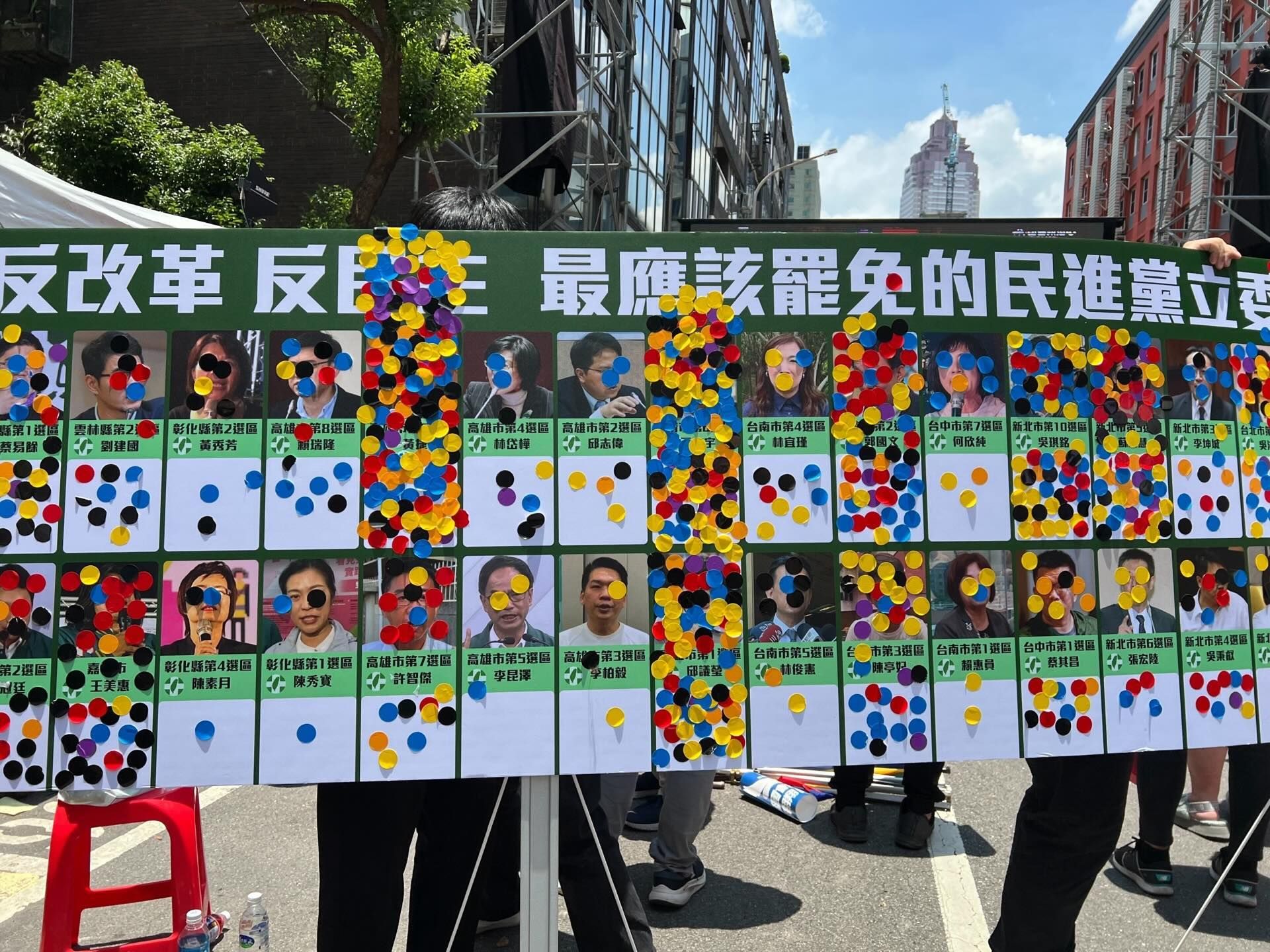 國民黨「藍鷹行動」於今(21日)上午8點半展開,藍營支持者也在活動中發起「反改革、反民主,最應該罷免的民進黨立委」投票,第一名為吳思瑤,第二名為黃捷,鍾佳濱、王定宇、郭國文、邱議瑩、蘇巧慧、吳琪銘等人投票格也被貼滿到看不到照片,李柏毅、陳秀寳、李昆澤和陳素月則僅被貼了三張貼紙。