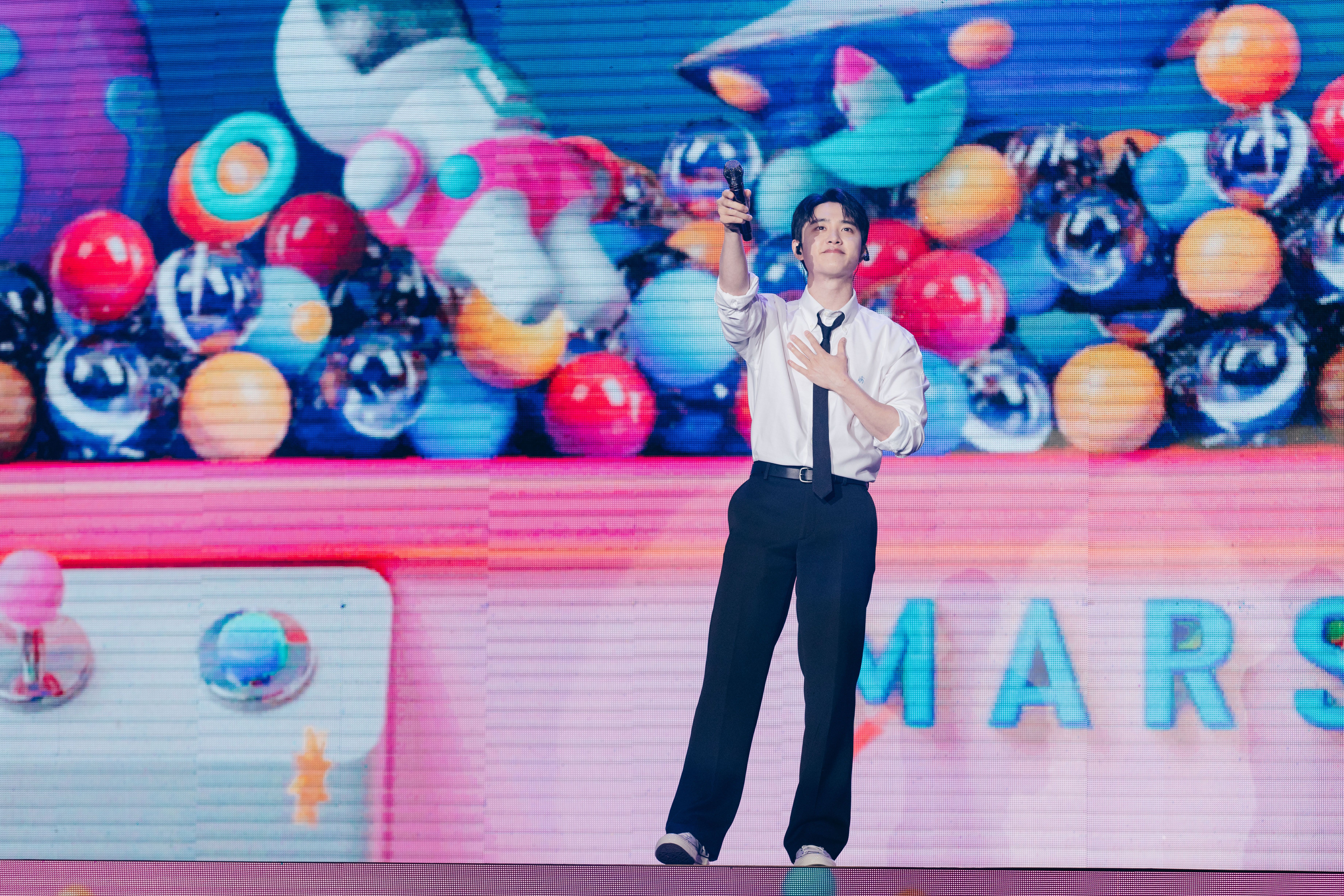 人氣偶像都敬秀(D.O.)今(22日)明兩天將在台北天母體育館會粉絲,首場演出,他身穿帥氣白襯杉演唱新專輯的主打歌〈Mars〉開場,並用流利的中文向現場粉絲們打招呼「大家好,台北!歡迎大家!」立刻讓全場熱情高漲,他說:「歡迎來到我的第一場Fan Concert巡迴BLOOM,隔了很久再見大家,所以更感到開心,謝謝你們用大大的愛歡迎我。」