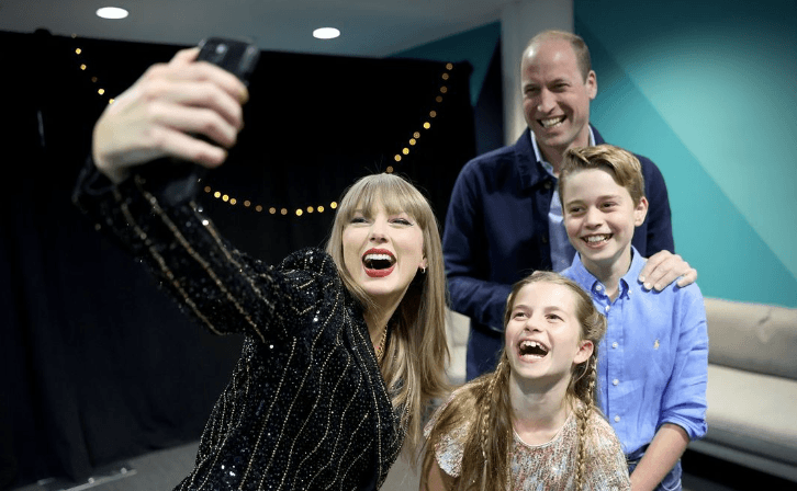 威廉王子22日在Instagram曬出和泰勒絲的合照,只見泰勒絲高舉手機和威廉、喬治、夏綠蒂開心合照,開口大笑的樣子有別於王室成員平時的嚴謹模樣,相當活潑,威廉王子也在文中提到,謝謝泰勒絲給了他們一個快樂的夜晚。