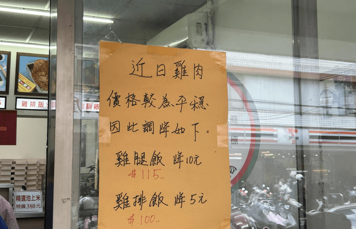 一名網友在臉書「路上觀察學院」上貼出一家便當店的公告,上頭寫著「近日雞肉價格較為平穩,因此調降如下」,只見雞腿飯調降10元為115元,雞排飯調降5元為100元。據悉,該間便當店位於台中市大甲區,是當地人熟知的口袋名單。
