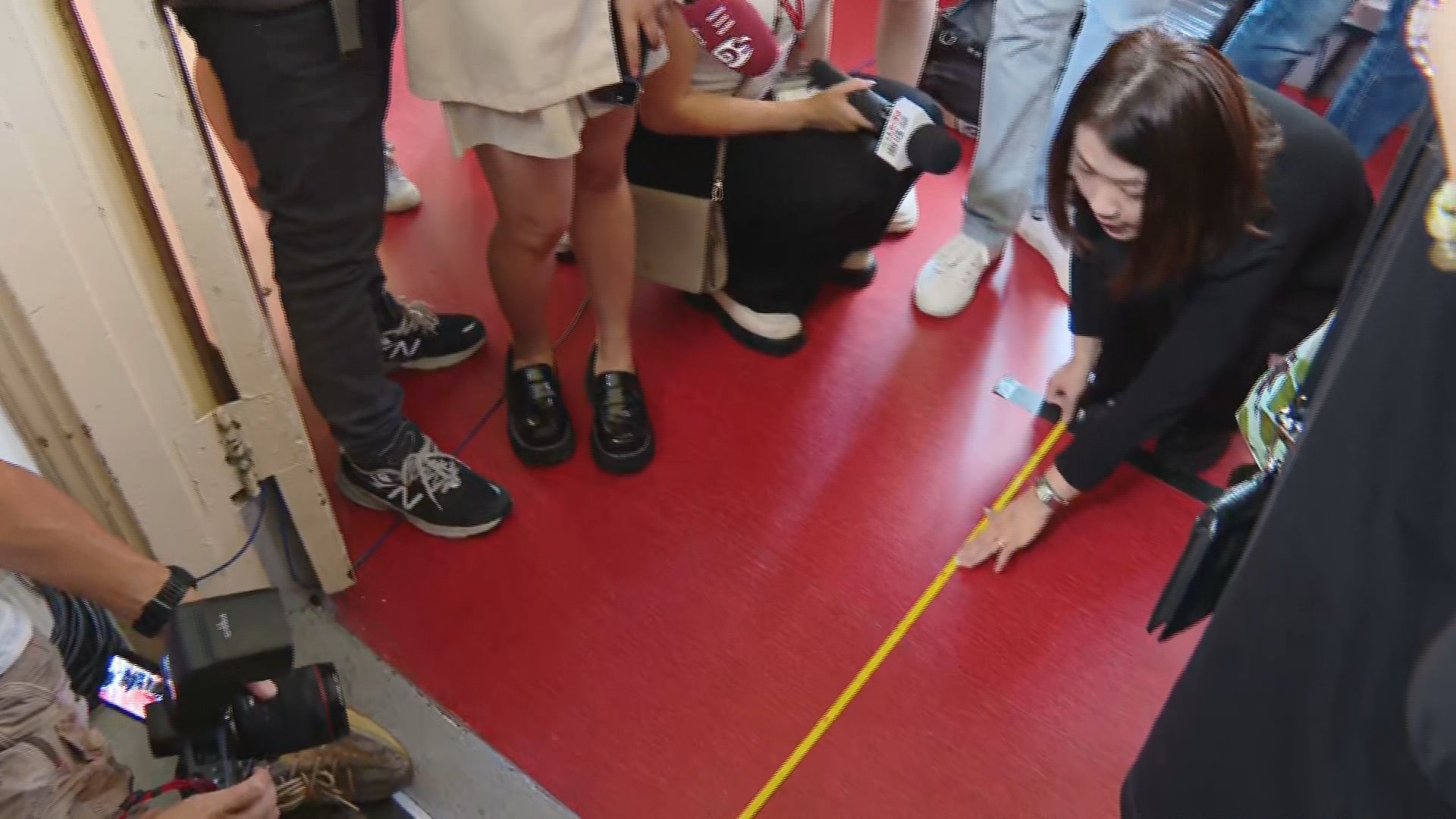 《立法院職權行使法》及《刑法》藐視國會罪修法今(26日)生效,民進黨立法院黨團上午舉行記者會,說明要去向司法院提出國會職權修法釋憲,徐巧芯依預告前往旁聽,自認距離100公分就不會影響記者會,於是蹲地拿出捲尺測量,在走廊上貼黑色膠帶。