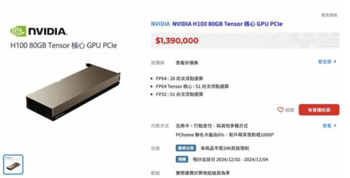 一名網友在PTT以「PChome Nvidia H100 $ 1,387,976」為題發文表示,5日發現PChome無預警上架「NVIDIA H100 80GB Tensor 核心GPU PCIe」,售價為139萬元,且立即下訂還可折扣2024元,讓他直呼「太佛了吧,一重整才發現已經賣完了QQ」。
