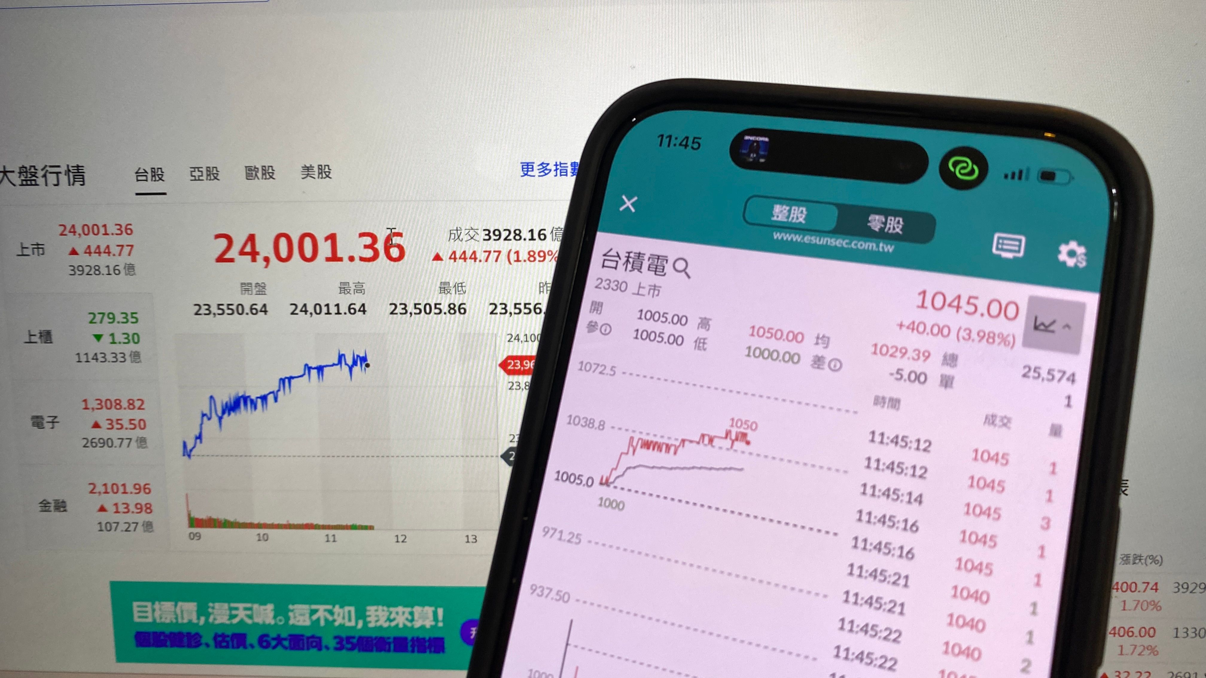 台股最新消息!盤中受到兩大權王台積電、鴻海帶動之下,加權指數大漲超過400點,一舉攻上2萬4千點大關。