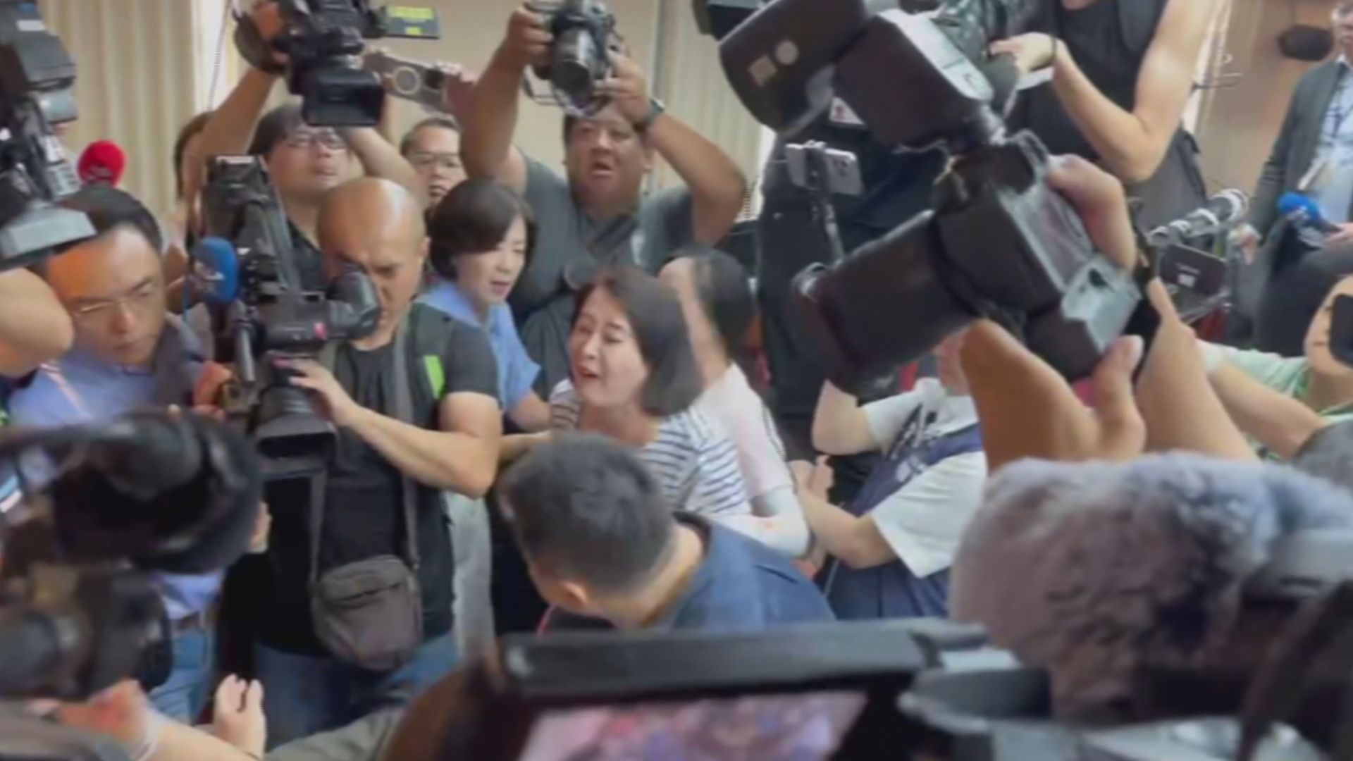 在會議室門開啟後,藍綠雙方開始推擠,導致現場一片混亂。而在激烈混戰當中,國民黨立委王鴻薇看到民進黨立委林楚茵坐在主席台的椅子上,就想把林楚茵拉離座位,不過過程中王鴻薇卻多次掌摑林楚茵,林楚茵事後也在社群平台上控訴王鴻薇「打到下巴都見血」。
