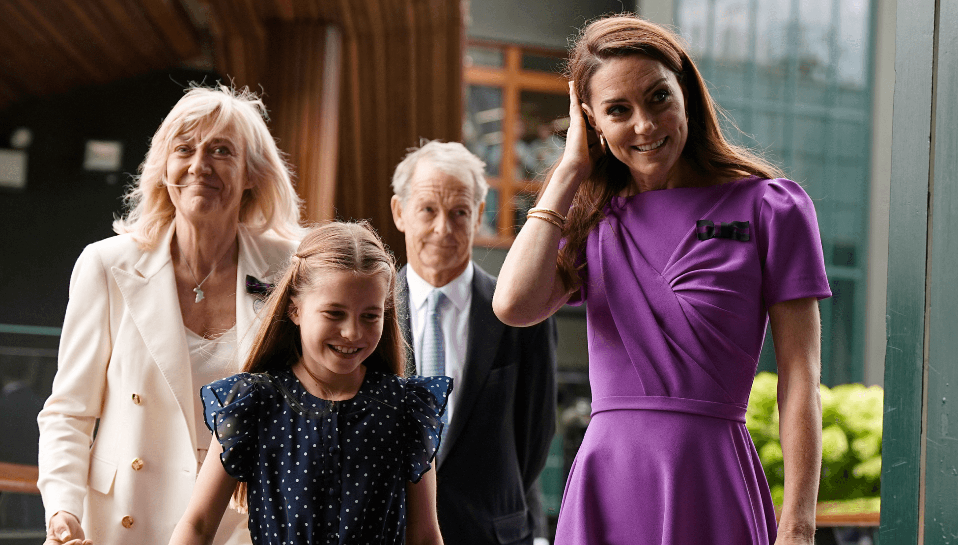 凱特王妃穿著一襲紫色禮服現身,擔任男單冠軍獎盃的頒獎人,親自頒獎給西班牙強將艾卡拉茲,雖然凱特王妃抱病出席,但風采依舊。夏綠蒂公主則身穿深藍色洋裝,上面有白色圓點點綴,有趣的是,夏綠蒂公主與凱特王妃都戴著墨鏡觀賽,母女2人穿著類似色系的服飾,舉手投足相當優雅。