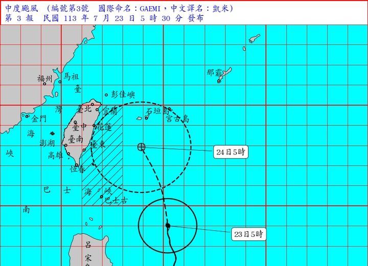 今年第3號中度颱風「凱米」,23日清晨2時中心距離鵝鑾鼻東南方約570公里的海面上,以北北西轉北的方向進行,預計週三(24日)晚上至週四(25日)中心最接近台灣,風雨也最明顯,風雨強度將視其路徑偏轉角度、暴風半徑及強度發展而定;而位於南海的第4號輕度颱風「巴比侖」,持續朝西北方向前進,即將減弱為熱帶性低氣壓,對台灣沒有影響。