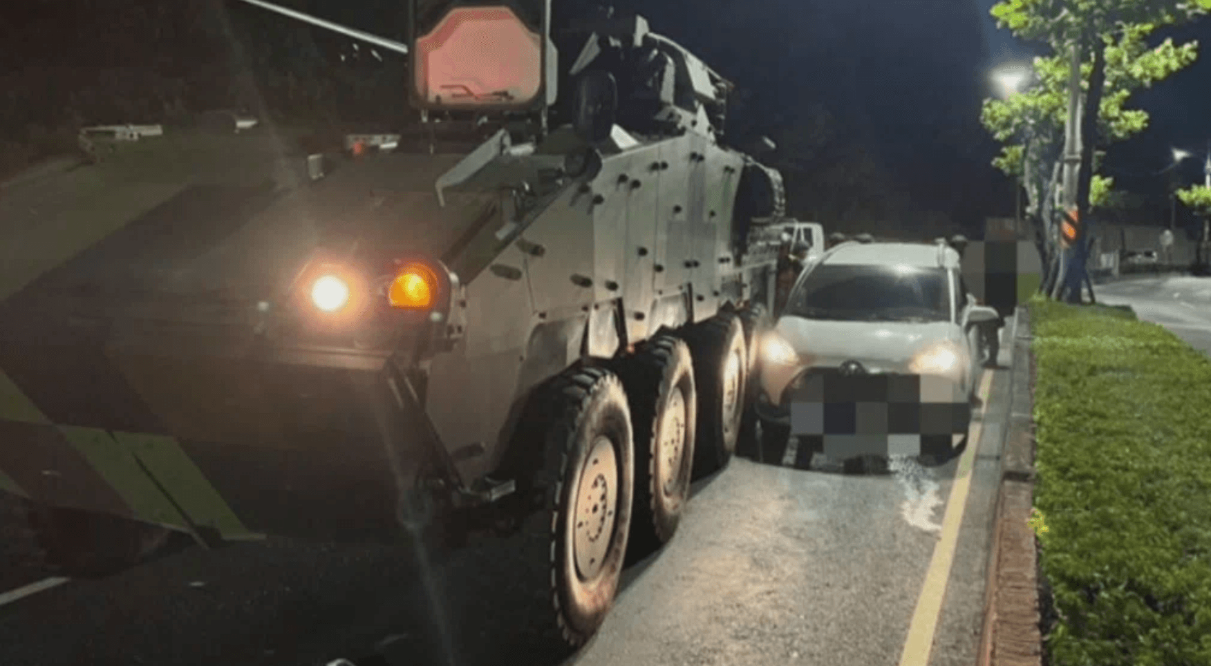 為期5天的漢光40號演習昨天(22日)展開,不過22日晚間8時許,一輛雲豹裝甲車與民眾汽車擦撞,只見汽車右前方的車門變形,看來撞擊力道不小。陸軍第六軍團今天(23日)發布新聞稿回應,承諾會強化演習期間交通安全管控。