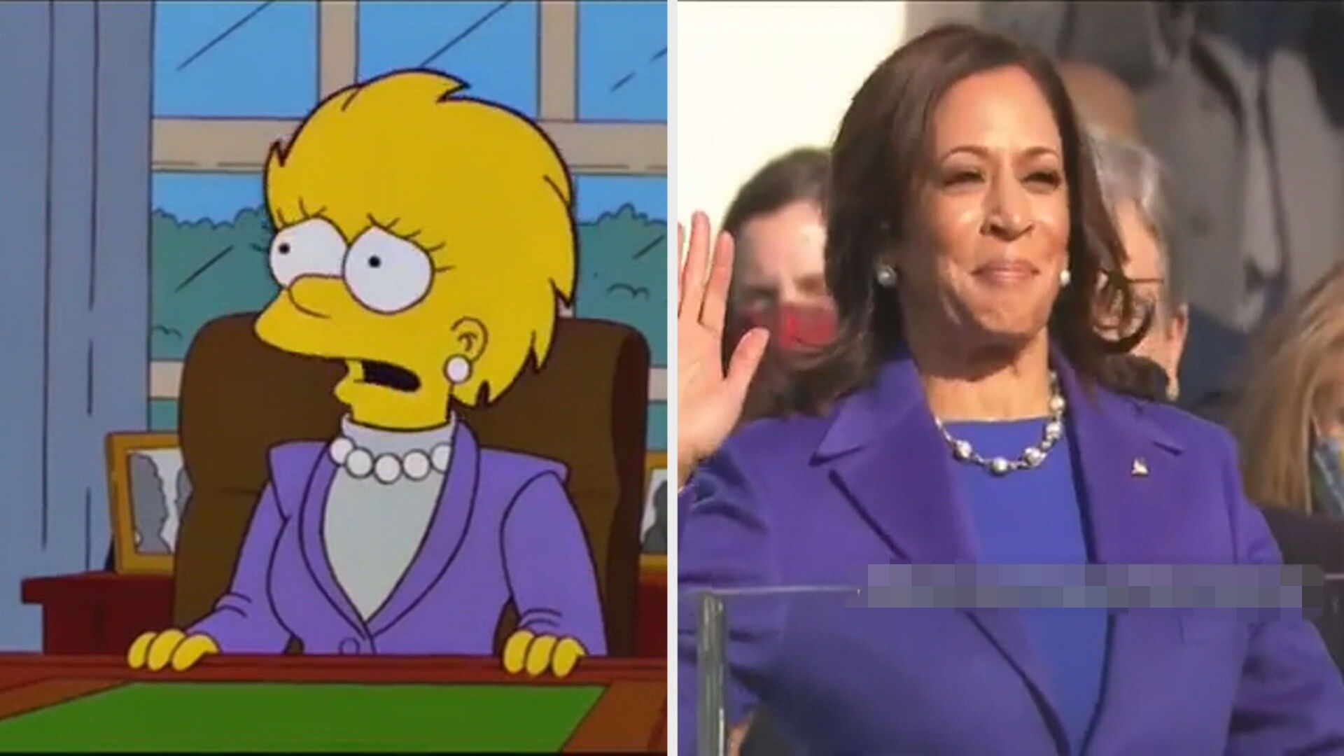 綜合外媒報導,動畫《辛普森家庭》2000年3月首播的第11季第17集,名為「巴特走向未來(Bart to the Future)」,內容描述辛普森一家的第二個孩子、花枝(Lisa Simpson)是美國總統,有網友發現,花枝在該集中穿著紫色套裝和珍珠項鍊,和賀錦麗(Kamala Harris)2021年宣誓就職的穿搭相似。