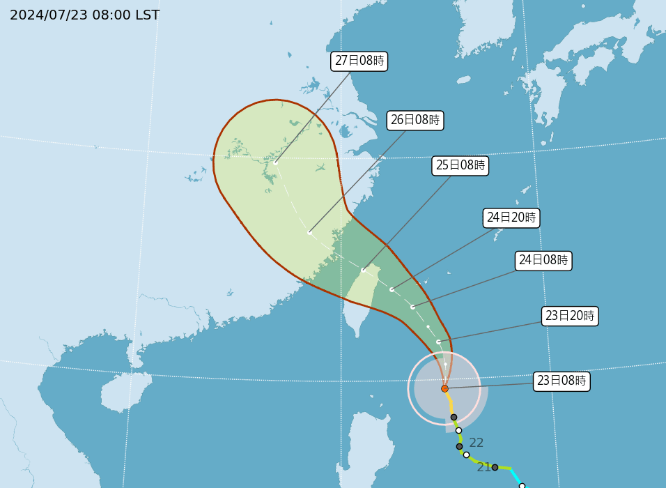 降雨趨勢方面,週三、週四颱風逐漸靠近,全台有大雨或豪雨,西半部山區、宜蘭山區、台東山區有大豪雨等級發生機會,中部及南部山區可能有超大豪雨,週五(26日)颱風逐漸遠離,不過後續中南部水氣仍多。劉宇其表示,凱米颱風將維持中度颱風強度接近台灣,並達中颱上限。