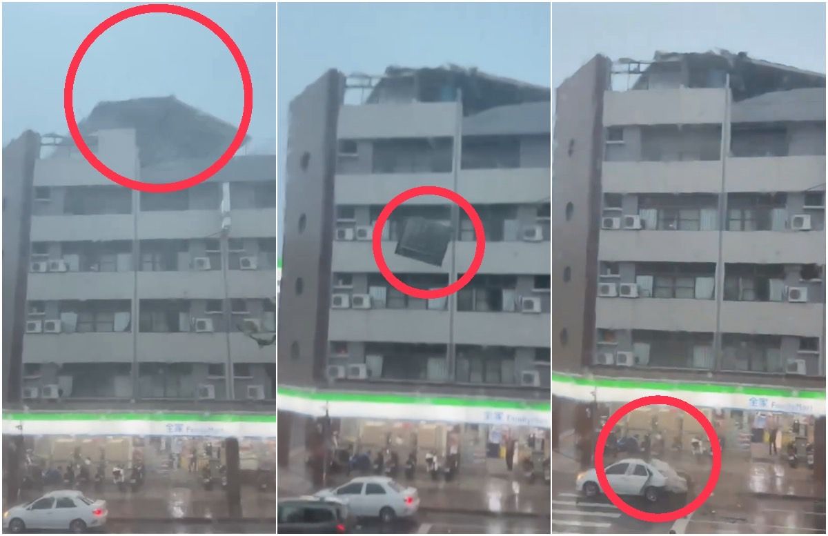 事發過程剛好被對面大樓民眾拍下,只見事發大樓的頂樓上一整片鐵皮屋頂被吹掀,下一秒大面積女兒牆應聲下墜,砸中剛停在一樓超商前不久的白色轎車,巨大聲響伴隨而來的是車身後半段全毀,接著小客車還往前開了一小段,駕駛下車查看後,試圖拉開右後方車門未果。
