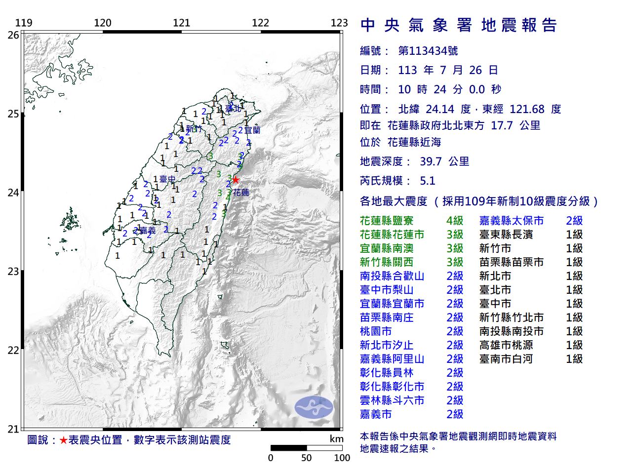 今(26日)上午10時24分,花蓮縣近海發生芮氏規模5.1地震,深度39.7公里,最大震度4級。對此,中央氣象署地震測報中心科長廖哲緯表示,此次地震屬於0403花蓮地震的餘震範圍內,因未達國家級警報標準,未發布警報。