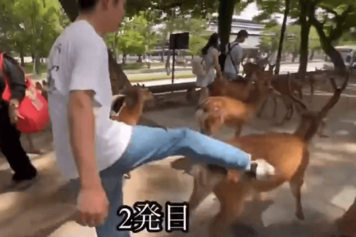 旅客到日本奈良公園,絕對不會錯過一睹可愛萌鹿風采,不過近日社群上瘋傳一段觀光客踹鹿的影片,拍攝者聲稱出腳的男子是中國人,引來日網撻伐,不過公園管理處表示,不確定施暴者國籍,但日警已介入調查,並加強周邊巡邏。