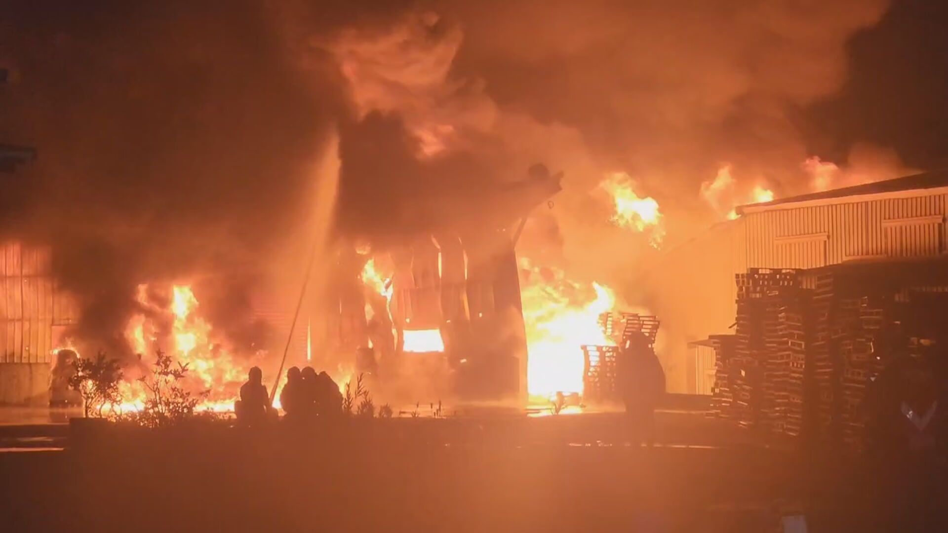 烈火照亮夜空,燃燒得相當猛烈,整個鐵皮屋全都付之一炬,而裡頭存放的是大量的塑膠粒以及色粉,由於現場溫度太高,打火弟兄無法靠近,加上現場消防栓的水壓不足,當下只能先控制火勢確保不會往外擴及,再想辦法調度水車來救援,至於詳細的起火原因,還有待釐清。