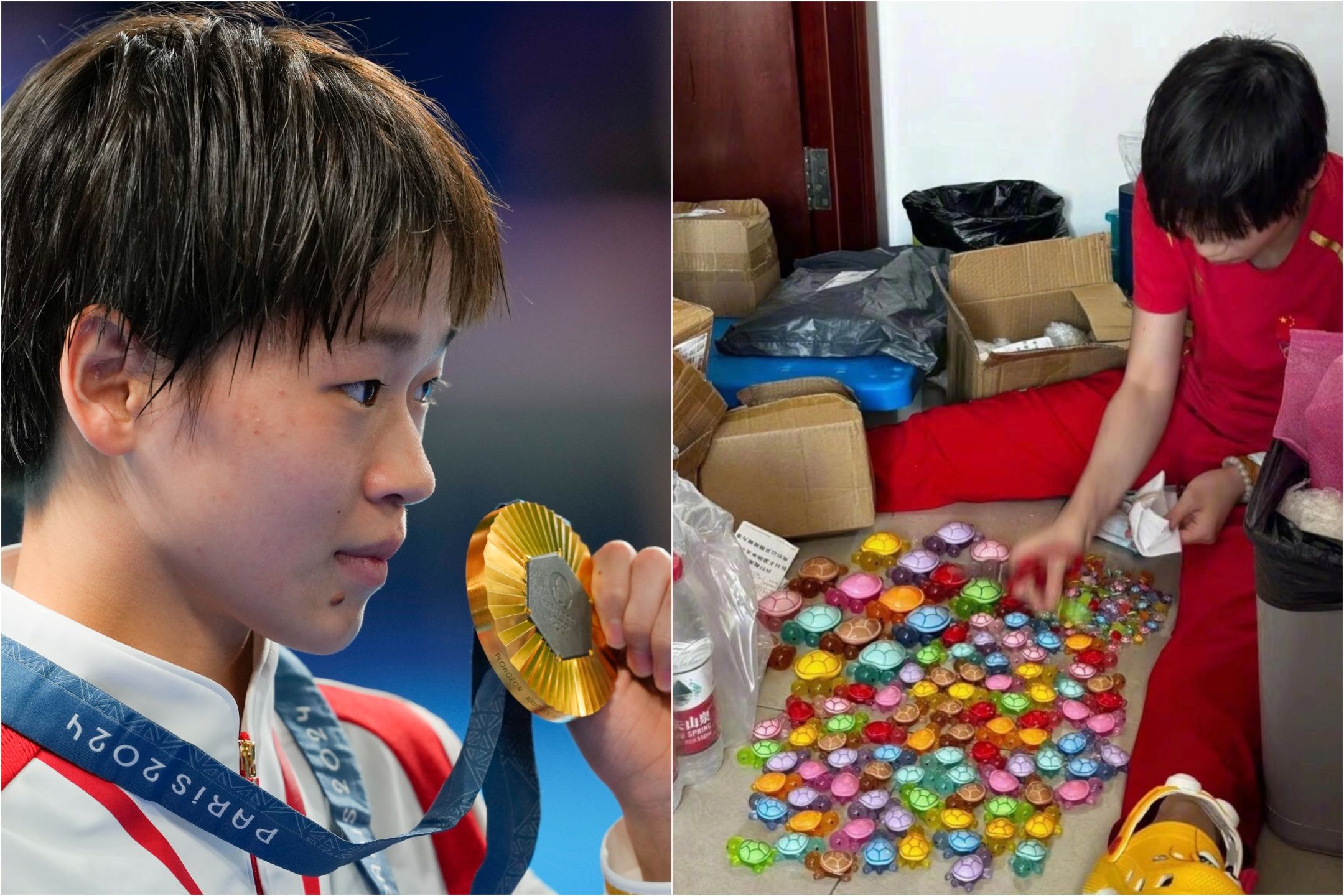 中國17歲跳水選手全紅嬋在本屆巴黎奧運的女子雙人10公尺、女子10公尺項目奪下金牌,再次憑藉「水花消失術」成為話題人物,台上的她非常專業,下台後則是可愛少女,不僅受訪時經常秀出放滿動畫、漫畫、偶像等周邊商品的包包,以及許多烏龜玩偶,回國後還在社群展示大批「烏龜盲盒」玩具,只見地板滿滿大大小小的彩色烏龜,讓網友笑稱要「理性消費」、「歡迎奧運王者龜來」。