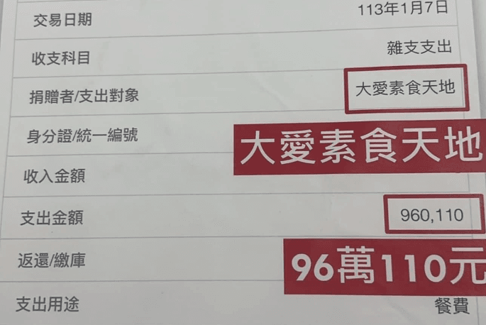戴于文表示,監察院網站顯示,購買大愛素食館,費用為960,110元,但經過對帳清查,找出兩筆收據,一筆為2023年9月7日購買110元,一筆為2024年1月7日購買960元,但會計師受託登打時,將兩筆直接誤登為960,110元,致使外界誤解,此一款項會盡快向監察院補正。