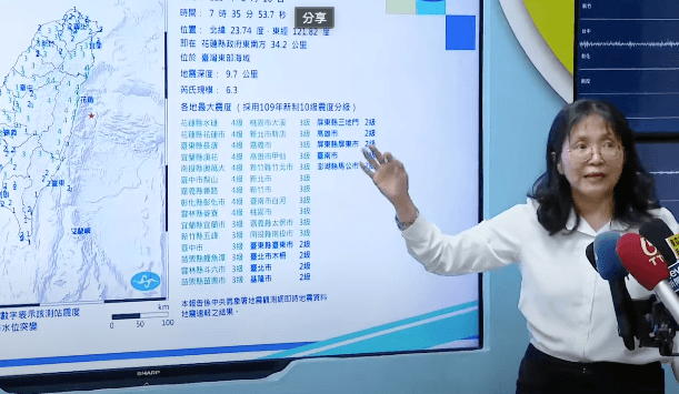 氣象署觀測,今(16日)上午7點35分花蓮外海發生規模6.3地震,震央位於北緯23.74度,東經121.82度,即在花蓮縣政府東南方34.2公里,地震深度9.7公里,最大震度為花蓮4級,包括台北市、新北市、新竹市、新竹縣、苗栗縣、台中市、南投縣、雲林縣、嘉義市、嘉義縣、台南市、台東縣發布國家級警報,後續短短1小時就再有9起餘震。