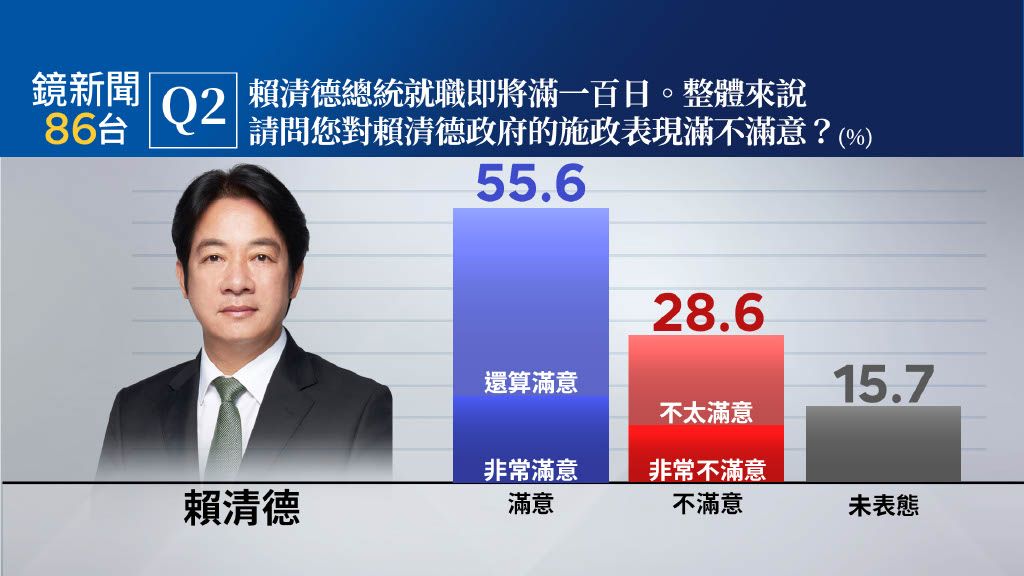 首先,關於賴清德總統上任百日施政滿意度,55.6%過半數的民眾表示滿意(16.7%非常滿意、38.9%還算滿意)、28.6%民眾表示不滿意(10.6%非常不滿意、18.0%不太滿意)、15.7%未表態。
