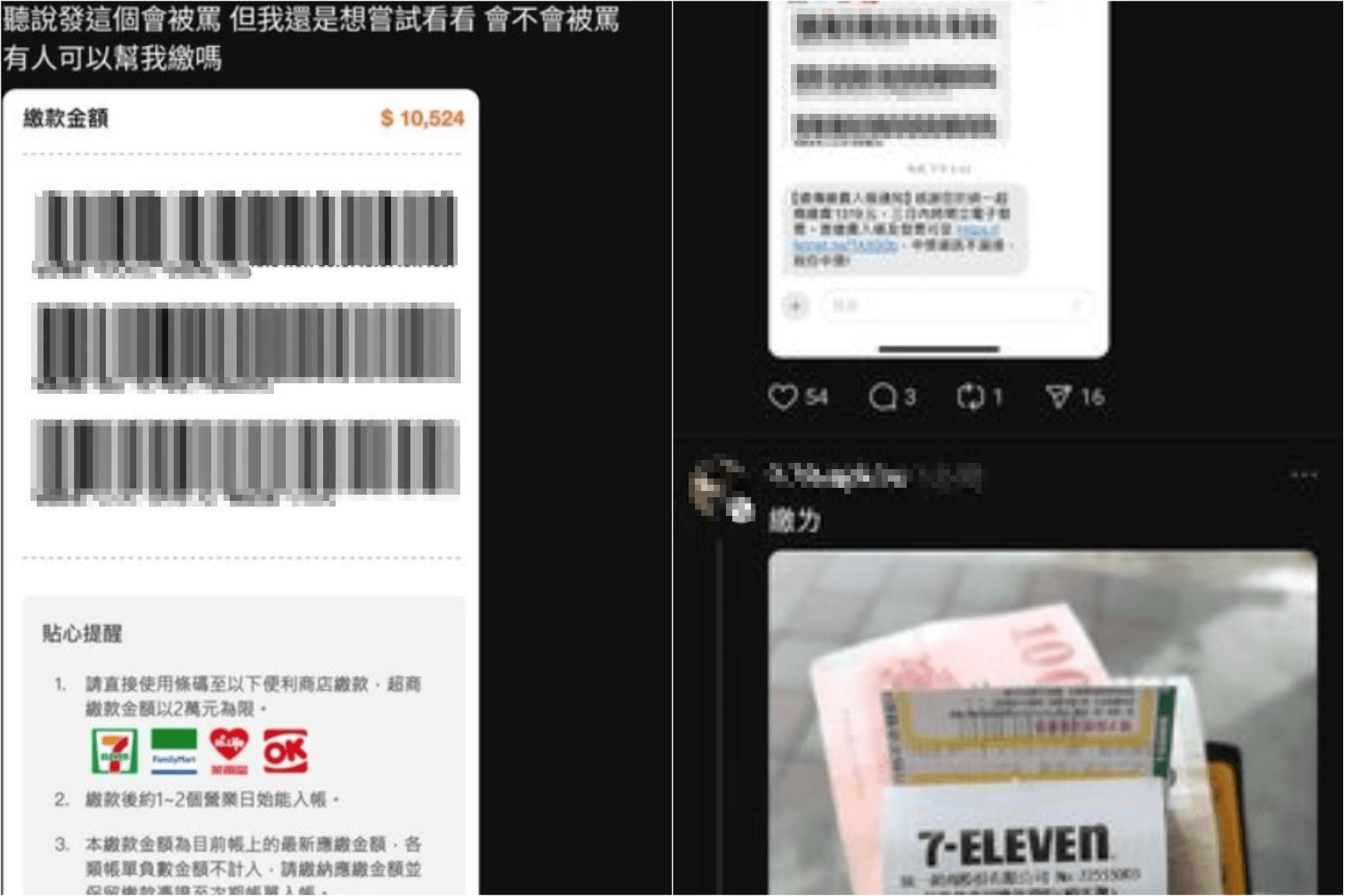 有網友臉書社團「爆廢公社」發文,分享多張Threads的串文截圖,內容全是「帳單繳費代碼」,有信用卡費、電話費、學費等,金額百元至萬元不等,網友們喊話「有人願意幫忙繳費嗎?」竟真的有人幫忙繳費,還拍收據證明,因此引發模仿潮。