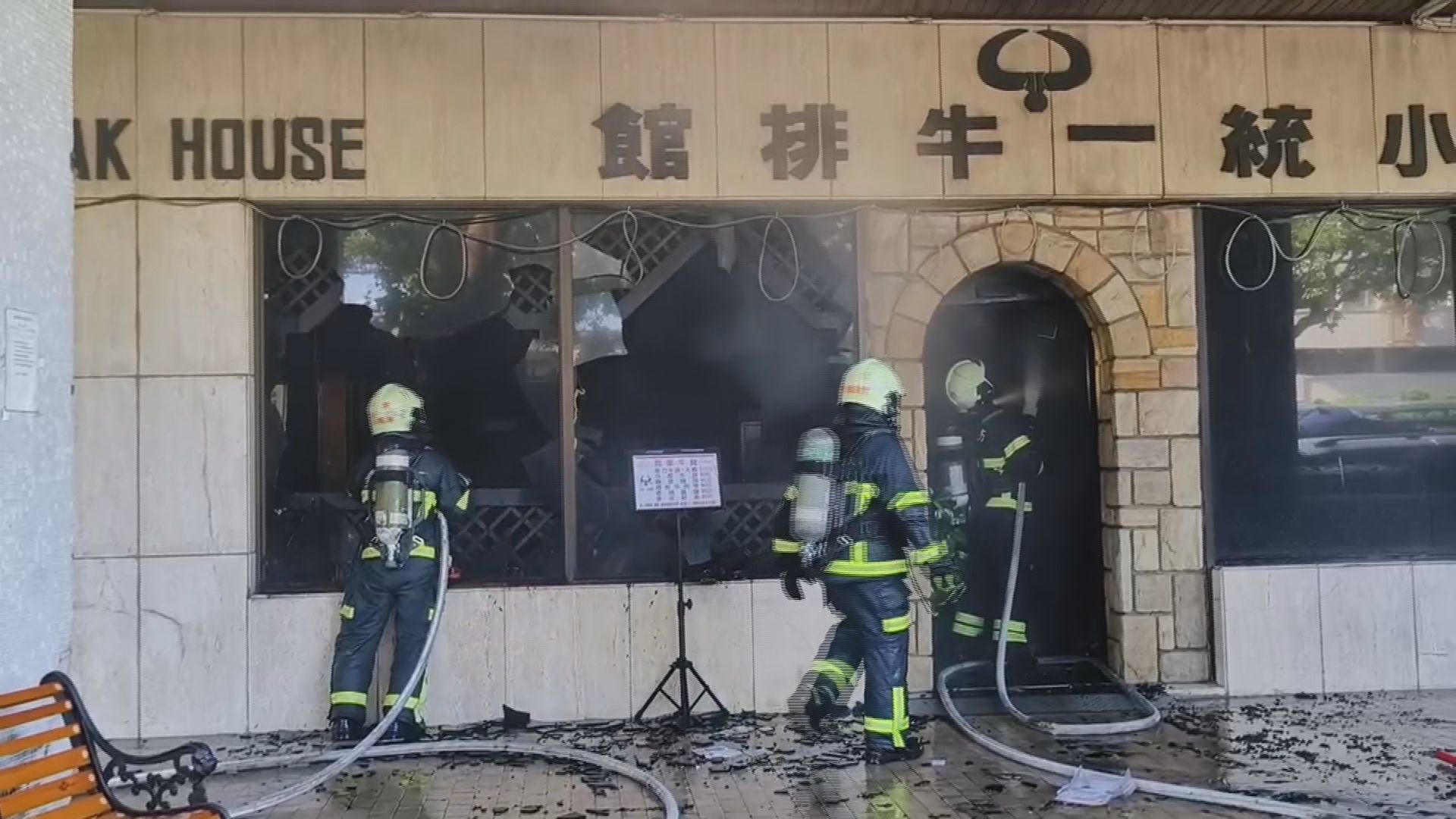 透過畫面可以看到,牛排館一樓不斷竄出濃煙,消防隊員射水灌救,所幸餐廳內部無人受困,樓上11名住戶也緊急疏散。