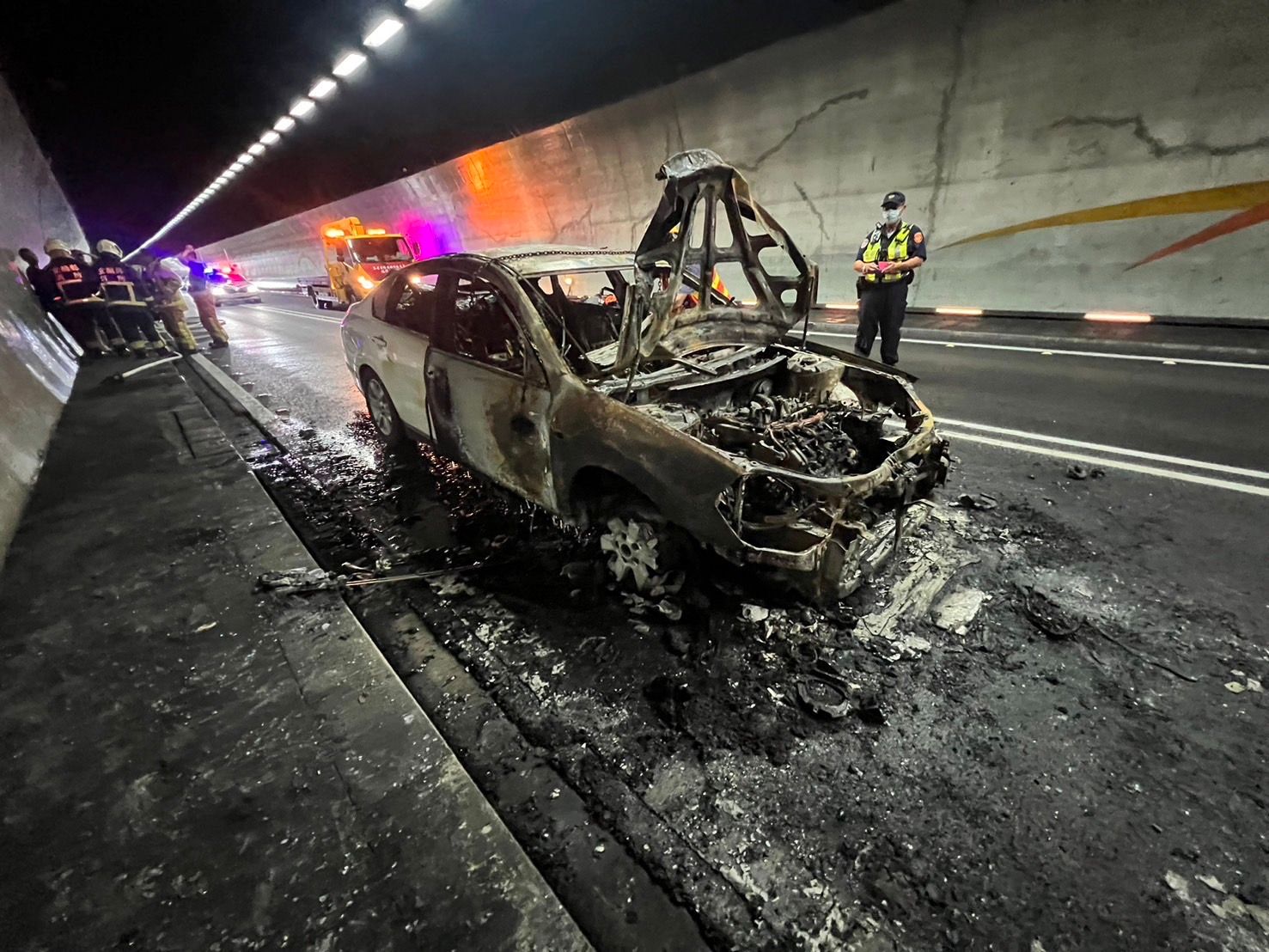 國五雪山隧道內今(8日)下午發生火燒車,現場駕駛目擊,小客車突然冒煙燒成火球,雖然消防人員及時趕抵撲滅火勢,小客車還是燒到只剩下骨架,且隧道內濃煙瀰漫,畫面驚悚,所幸車上2人及時逃生,未有人員傷亡。