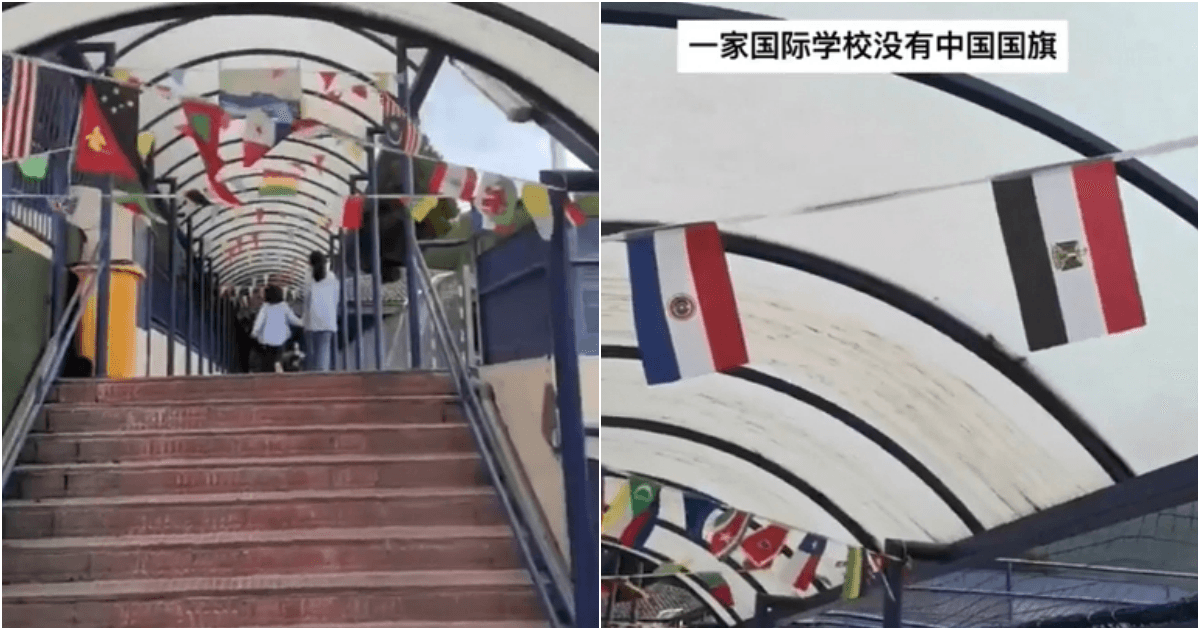 某中國民眾到位於西班牙馬德里的SEK國際學校,學校的廊道上方懸掛各國國旗,但是唯獨看不到五星旗,加上國旗與國旗之間出現明顯空缺,被質疑明明仍有位置可以掛上五星旗,卻獨漏中國國旗,讓這位中國民眾不滿直呼:「這有每個國家的,就沒有中國的,這個是搞什麼鬼啊!」