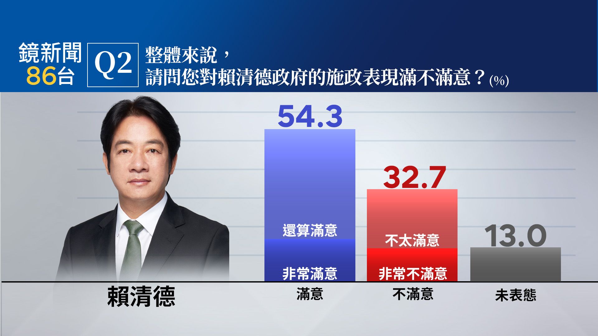 賴總統施政滿意度大調查 過半數54.3%滿意、32.7%不滿意