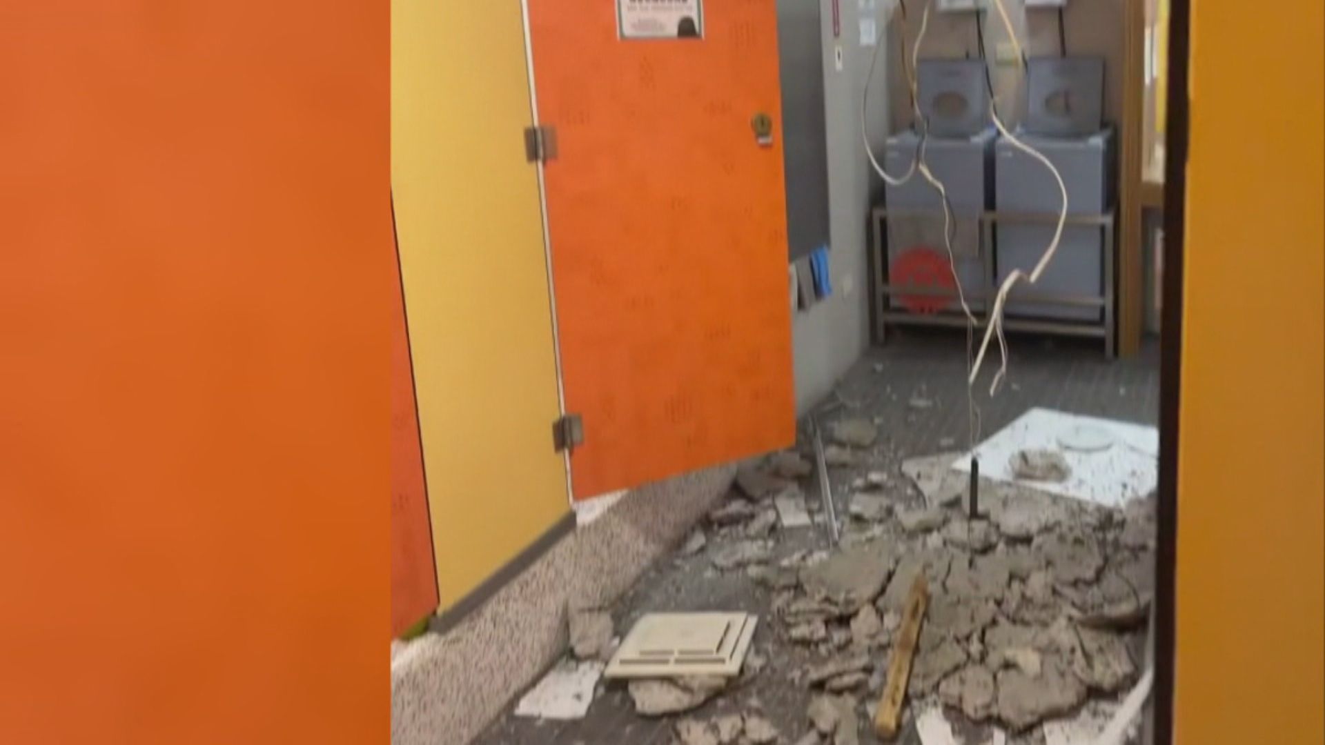 畫面中可以看到,廁所地板上大塊小塊磁磚都有,甚至還有電線懸掛半空中,觸目驚心,不過幸好當下沒有人受傷。