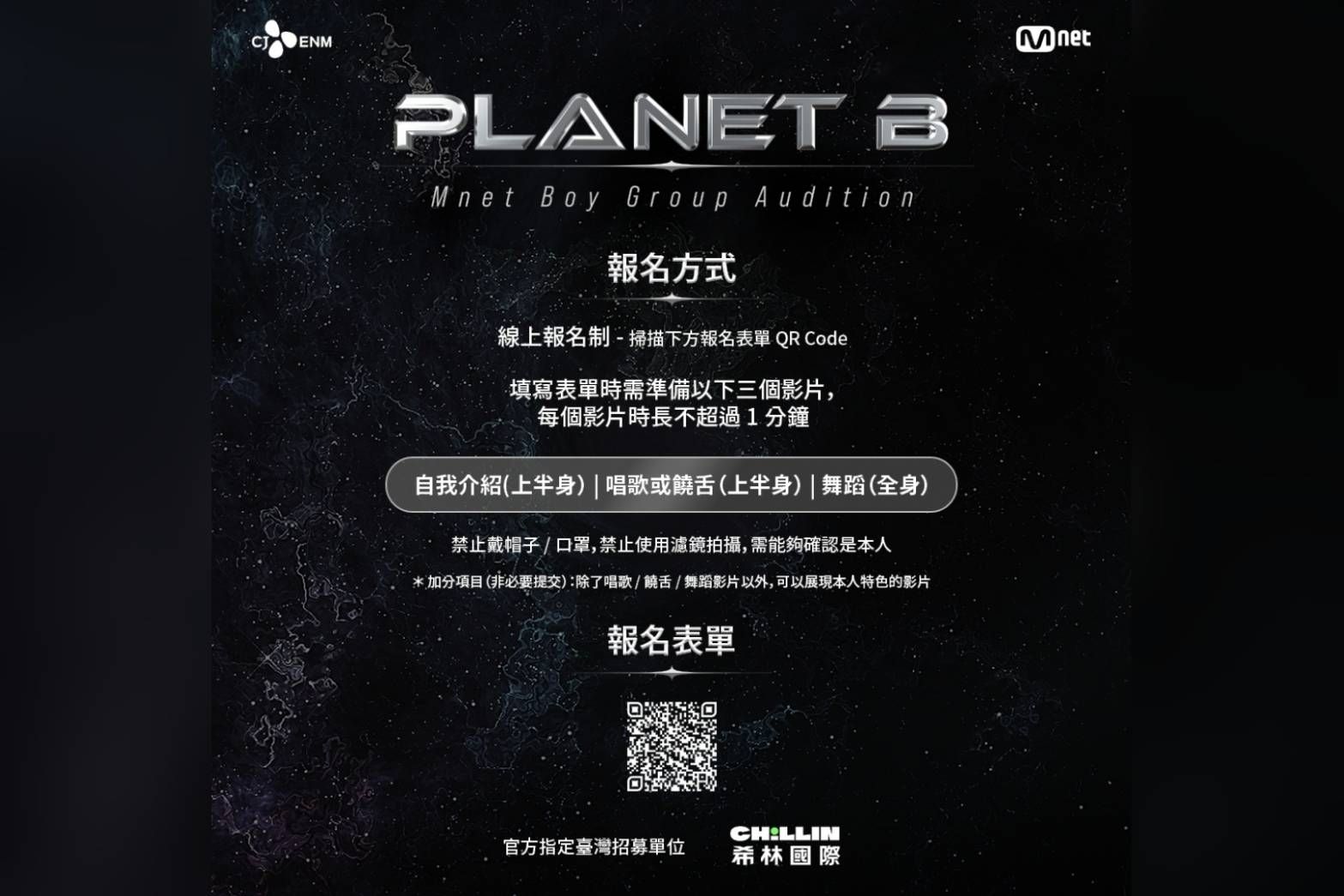 《Mnet》電視台為了準備2025年預計播放的新國際男團選秀節目前哨戰《PLANET B》招生計畫,計畫從世界各地發掘擁有才藝與明星氣質的選手。這次節目的製作團隊將由ENHYPEN出道節目的ILAND團隊參與,本次官方指定台灣招募單位「希林國際」也公布招募資訊,招募採線上報名,報名日期從今日開始直到招滿為止,凡是2012年1月1日前出生的男性,不限國籍、居住地區及是否有相關演藝經驗均可參加招募,歡迎懷有星夢且符合條件的男性報名;更多詳細資訊可密切鎖定希林國際Chillin International臉書粉絲專頁。