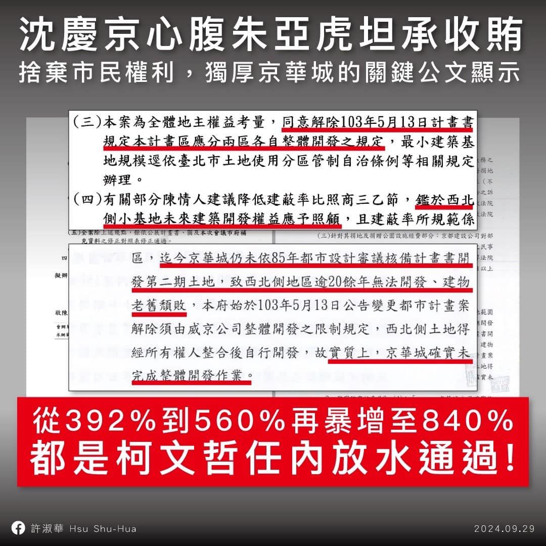 許淑華認為,有人行賄,就代表有人收賄,並曝光柯文哲2017年獨厚京華城、捨棄西北側市民權利的關鍵公文,從調閱公文書顯示,「京華城從 392%-840%都是柯文哲任內同意」,京華城要從工業區變更為商業區,80年公告都市計畫書有附帶條件,「必須連帶西北側老屋群進行大街廓開發」,但威京集團多年來未達要求,560%容積才一直無法過關。