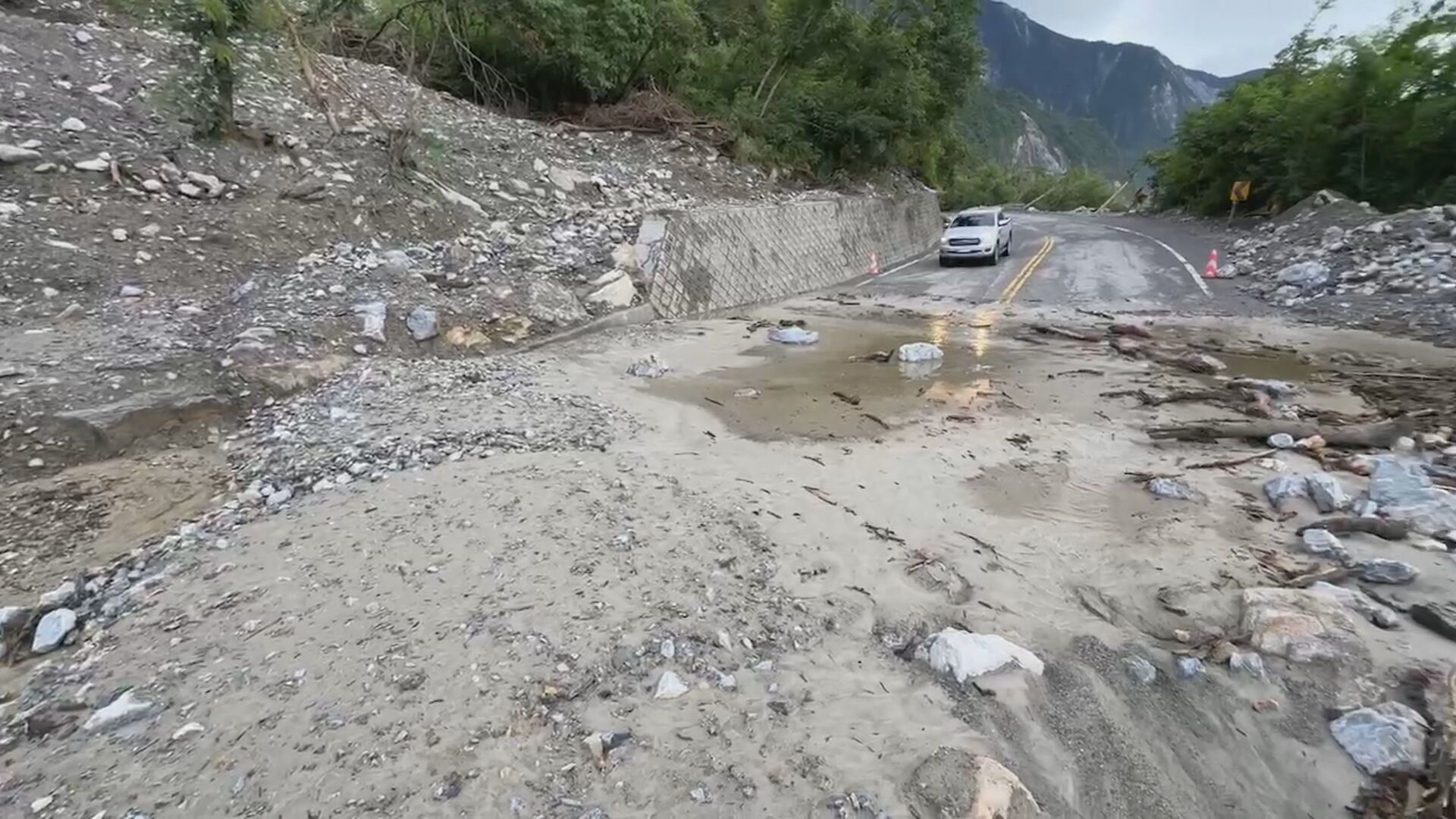 大小不一的碎石散落一地,整條路上全都是黃土淤泥,一旁還有斷裂的樹幹,就連擋土牆也被土石沖破,這裡是蘇花公路崇德路段,30日晚上發生土石流,所幸蘇花公路30日就進行預警性封路,因此沒有人車受到波及。