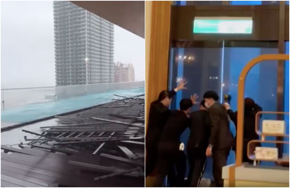 而漢來大飯店大廳玻璃門、旋轉門,都受強風吹襲關不住,畫面也被傳到網路上,只見玻璃門外風雨聲呼嘯,不只旋轉門有工作人員用肉身抵擋,玻璃門更是有超過5名成年男子抵擋,才勉強關起,畫面相當危險,工作人員臉上也寫滿無奈。