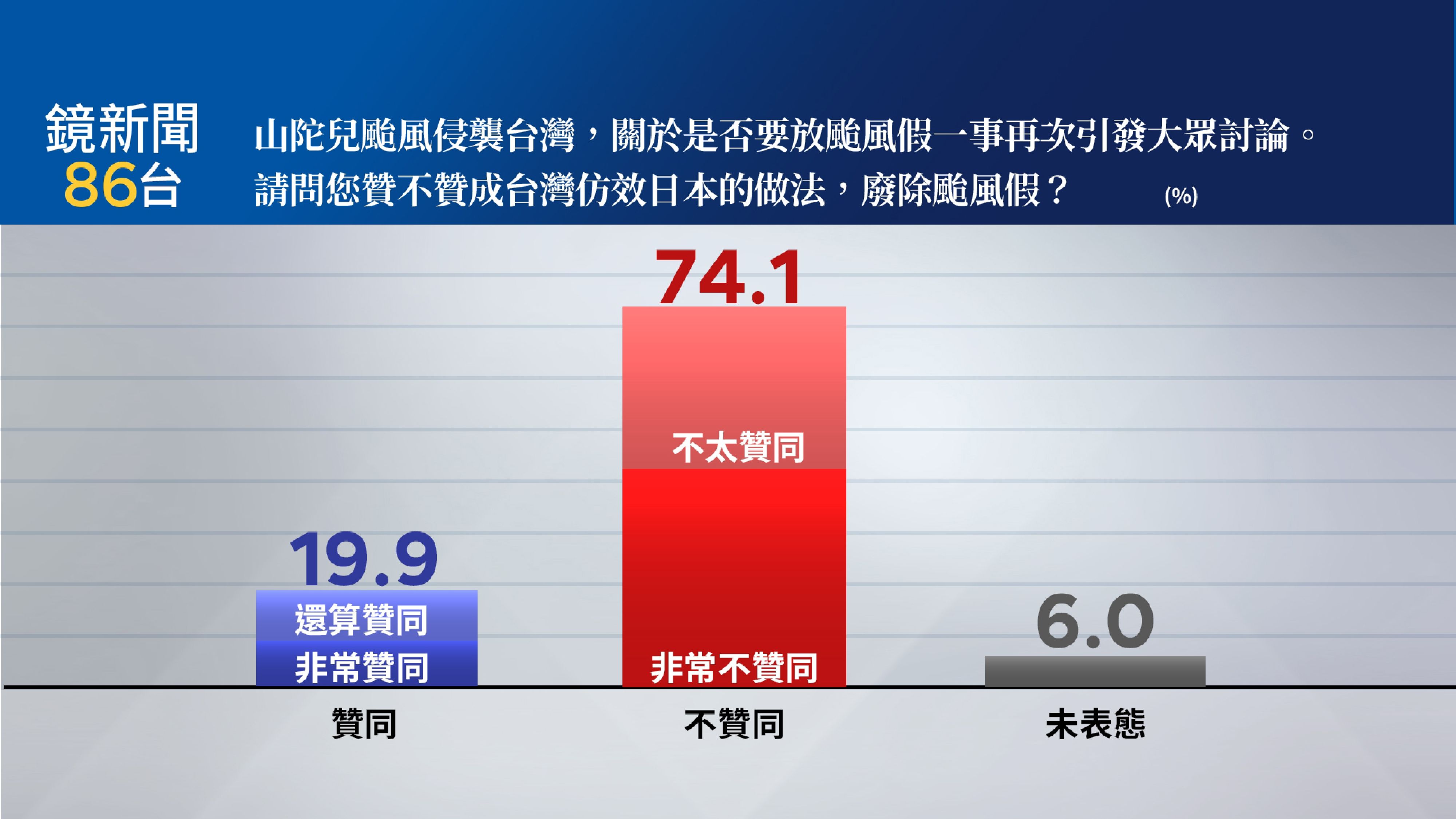 上週「山陀兒」颱風襲台,因其路徑詭譎、雨量與風勢驚人,部分南臺灣地區停班停課四天,風雨較不強的北北基桃也停班停課兩天,股市、匯市皆停擺,讓企業界直言,若以台灣GDP總值23兆元計算,放一天颱風假至少損失315億!究竟颱風假該不該放?再次引發強烈爭議,根據鏡新聞最新調查顯示,對於台灣是否應仿效日本的做法廢除颱風假?高達74.1%民眾表示不贊成廢除颱風假(32.2%不太贊成、41.9%非常不贊成),僅19.9%表示贊成廢除颱風假(9.9%非常贊成、10.0%還算贊成)。同時,有關於颱風假的決策,應由地方政府各自決定?還是該由中央政府決定?接近八成79.8%民眾表示應由地方政府決定,僅13.5%民眾支持由中央政府決定,2.1%民眾表示都可以,4.7%未表態。