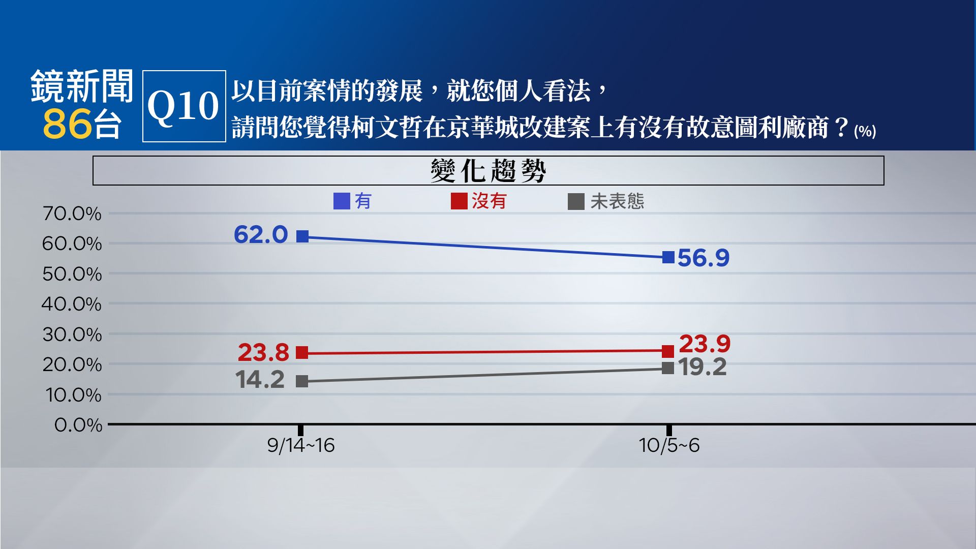對於柯文哲在京華改建案,有沒有貪污收賄?53.7%民眾認為有貪污收賄(26.4%一定有、27.3%可能有),27.9%民眾認為沒有貪污收賄(19.1%可能沒有、8.8%一定沒有),18.3%未表態。調查顯示,認為柯文哲有圖利的民眾較上月減少5.1個百分點、未表態也增加5個百分點,認為有貪污收賄的民眾較上月調查減少2.6個百分點、未表態增加2.5個百分點。